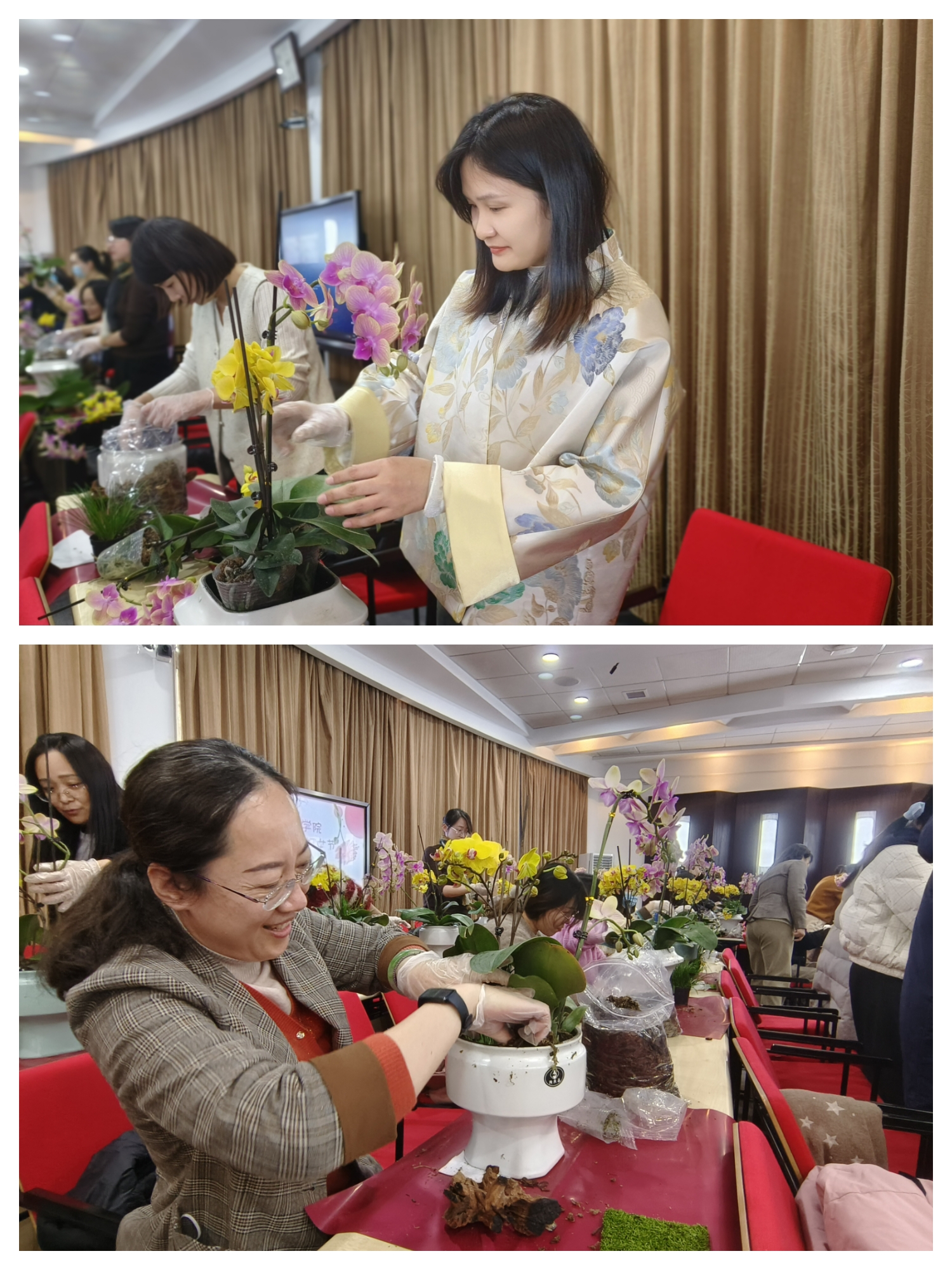 主持人首先转达了公司党委对全体女性教职工亲切祝福和美好祝愿,活动在亲清和谐的氛围中展开。倪老师为大家讲授了此次插花制作的设计理念以及选花、养护、颜色搭配、造型等艺术技巧,分享了各种花材蕴含的花语和祝福。各位老师面对文气十足的菖蒲、朵朵绽放的蝴蝶兰、造型独异的沉木和各色花器,拿起工具、插入花材,认真构思、反复斟酌、细致调整,创作出一盆盆错落有致,生机盎然、独一无二的插花作品。蝴蝶翩翩芳草意,一枝一叶园丁情。