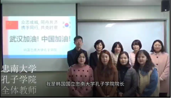 韩国忠南大学孔子公司的韩方经理康惠根教授和中方经理闵英兰教授组织带领教师志愿者们为武汉灾民捐款购买物资,为救助疫区奉献力量。2月18日,孔子公司师生们还录制了为中国加油的视频,以此鼓励中国人民战胜疫情。在视频中,康惠根代表孔子公司全体师生员工表示忠南大学孔子公司愿与中国共克时艰,战胜困难!并衷心地祝愿中国早日渡过难关。忠南孔院高级班的员工们也以视频的形式为中国加油,表达了他们盼望此次疫情早日结束的迫切心情。