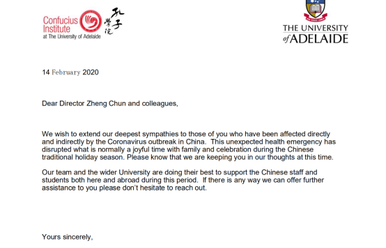 阿德莱德大学孔子公司澳方经理张宁老师寄来一封情真意切的慰问信,在信中,她表达了对国内疫情的关注,对国内工作人员的关心和惦念。她表示在这一特殊时期,孔子公司整个团队将尽力帮助海内外的中国职员和员工,尽一切力量做支援工作。据悉,阿德莱德大学孔子公司已指派两位本地志愿者,代表孔院参与到阿德莱德大学帮助中国职工的系列行动中;同时也正在与中澳青年联合会沟通,组织义卖活动,所得收入将支援国内疫情一线。