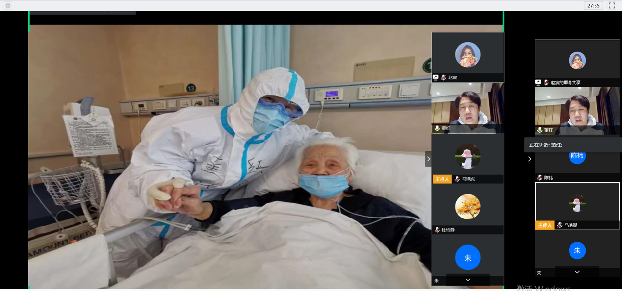 董红分享了她作为医护人员代表在前线奋战的经历。不悔的请战誓言、坚定的医护人员、艰苦的战疫环境……原本只出现在新闻报道中的场景,随着董红的讲述一一展现在眼前。2月9日,董红所在的山大二院援湖北国家医疗队出征武汉,24小时内整建制接管武汉同济医院E1-7重症病区,床位52张,都是重症和危重症病人。面对严峻的疫情形势,医疗队不分昼夜地高强度工作,只为能够挽救更多病人的生命。董红作为医疗队的联络员,她亲自为每一名护士穿戴的防护服把关,时刻牵挂着护士们的身体状况,组建“身体关注群”为每个护士建立健康档案,被队员们亲切地称为“门神”,在抗疫一线充分展现了一名中共党员的责任与担当。在湖北的52个日日夜夜,山大二院援湖北国家医疗队用精湛的医术、崇高的职业精神,递交了一份满意的答卷,并评为“全国卫生健康系统新冠肺炎疫情防护工作”先进集体,董红荣获“全国卫生健康系统新冠肺炎疫情防护工作”先进个人。