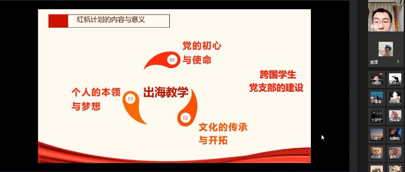 “红帆计划”立足支部成员出海教学这一专业特色,将自2020年4月起,历时两年时间,陆续开展“信仰领航”“本领护航”“梦想导航”三个板块的活动,引领支部成员将国家使命与理想信念教育紧密结合,将个人梦融入中国梦,以青春梦托起中国梦,帮助支部成员不断提升政治素质与实践能力,在海外“讲好中国故事,传播中国声音”。活动体现了支部建设与员工成长的有机结合,探索海外员工党建新模式,为建设组织有力、凝聚有力、工作有力的员工党支部做出积极尝试。