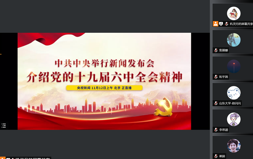 为深入贯彻学习党的十九届六中全会精神,11月15日晚19:00,2020级研究生党支部召开主题会议,通过观看直播、集中学习、分组讨论等丰富多彩的形式进行学习。此次会议由2020级研究生党支部书记李静悦主持。