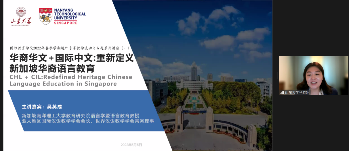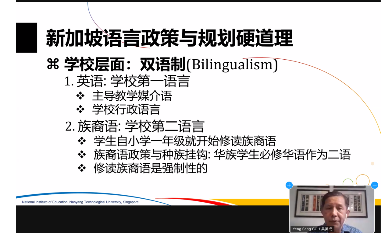 本场讲座为十大体育网站2022年春季学期境外专家教学流动岗专题系列讲座,将以“华裔华文+国际中文:重新定义新加坡华裔语言教育”“语言内外双循环:国际中文教育可持续发展新战略”“国际中文教学与学术活动:线上线下协同新模式”“游走于东西方学术之间:我的学思历程”为题开展四期主题课程讲座,讲座内容以走近新加坡为起点,探讨语言内外双循环下国际中文教育可持续发展的新战略,并聚焦新形势下国际中文教学线上线下协同的新模式,最后回归吴英成教授自己游走于东西之间的求学经历,分享身为一位学者的学思历程。