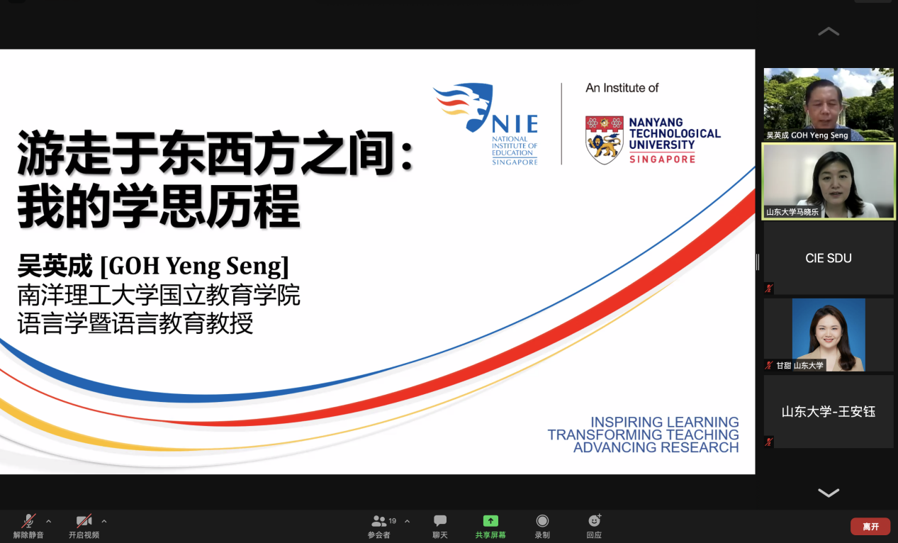 吴英成以东方语言学与西方语言学研究理念上的不同为起点,详尽生动介绍了个人的学术历程,特别是2010年出版中文著作《汉语国际传播:新加坡视角》、2017年出版英文著作Teaching Chinese as an International Language: A Singapore Perspective等里程碑事件。他鼓励青年教师要多涉猎多尝试不同课程教学,强调结合研究热点寻找研究兴趣的重要性。在国际中文教育待拓展领域方面,他提出五个见解,第一,作为国际中文教育研究者要做到广博与精深兼备;第二,要走向汉语研究的现代化,中文教学与中国发展同频共振,需要紧跟时代脚步;第三,注重科技在国际中文教育中的应用;第四,批判地借鉴海外语言学研究成果,注重自身双语能力的提升;第五,作为本土国际中文教育研究者需立足中华文明,放眼世界,实现“内外双修”,积极承担起作为中文传播者推动中文内外双循环的责任与使命。