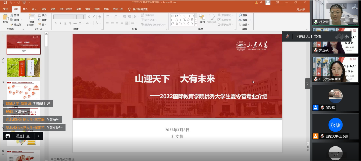 7月3日下午,杜文倩作客“学在山大”交流会,她以“山迎天下,大有可为”为题,从“走进山大”到“走进国教”,对公司和公司的基本情况进行了生动的介绍,就营员们关心的团队力量、招生情况、培养特色、实习平台等进行了系统全面的说明,交流会还邀请了硕士一年级的宋玉硕同学和张艺潇同学分享了在山大的求学和生活体验。随后,中华传统文化研究与体验基地的张惠玲老师带领营员们进行了一场云端之旅,对基地的设计理念、应用实践和体验项目等进行了详实介绍。营员们跟随镜头“云游”基地,参与了一系列沉浸式文化学习和体验式文化传播活动:在欣赏华美的汉服的同时感悟悠久的历史和底蕴,在孔子像前学习庄重的拜师礼,聆听悠扬的传统乐器,观摩源远流长的碑拓技艺,欣赏精美的创意剪纸作品,领会茶文化的精妙雅致,体悟瓦当纹样传递的吉祥与祝福。营员们纷纷表示收获满满,对中华文化的传播有了更深刻的认识。