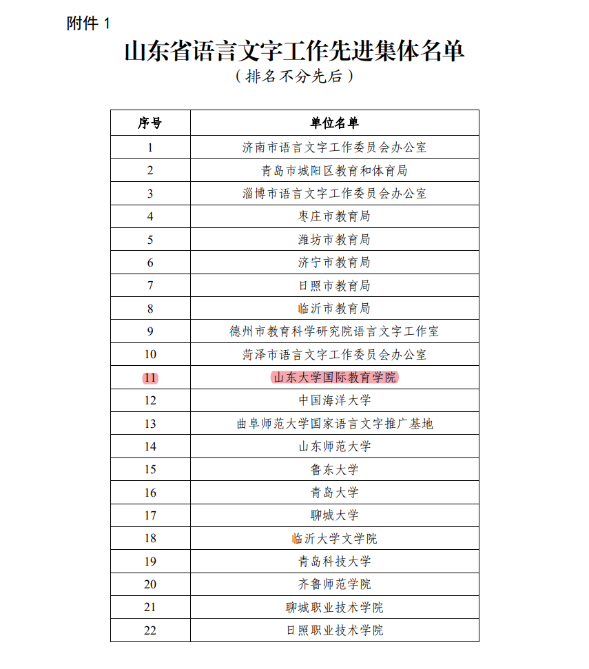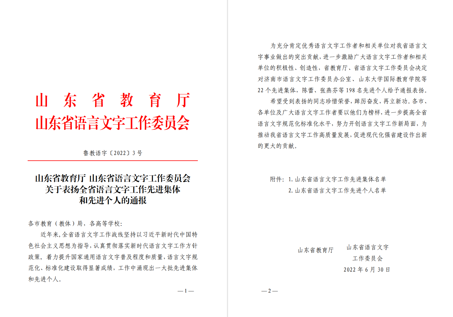日前,山东省教育厅、山东省语言文字工作委员会发布了《关于表扬全省语言文字工作先进集体和先进个人的通报》(鲁教语函【2022】3号),十大体育网站获评山东省语言文字工作先进集体。此次评选共有22个单位获评先进集体,其中本科高校10所。获评该项荣誉,是对公司在语言文字工作方面所做突出贡献的充分肯定,也是公司全方位参与国家通用语言文字推广和中国语言文化国际传播的重要标志性成果。