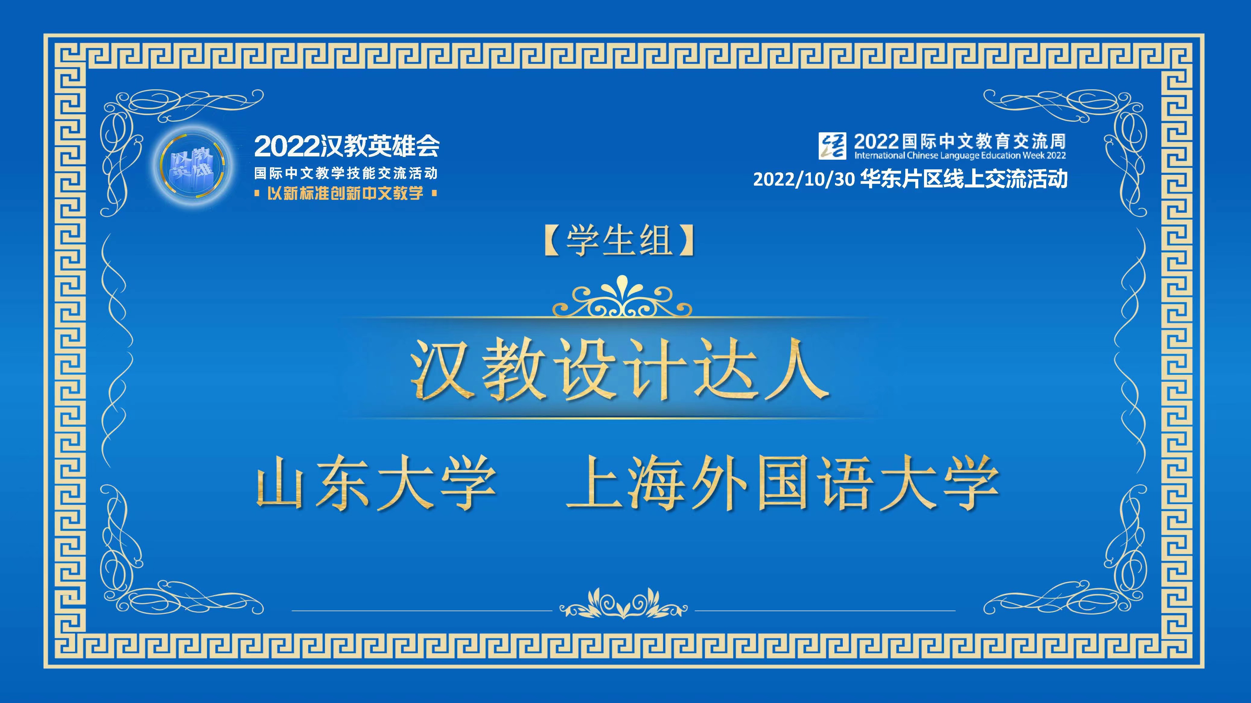 近日,由教育部中外语言交流合作中心、全国汉语国际教育专业学位研究生教育指导委员会联合举办的2022全国“汉教英雄会”华东片区国际中文教学技能交流活动圆满落幕,来自华东片区50余所院校的团队通过云端登台亮相,分享教学理念,展示团队风采。十大体育网站组建的十大体育网站员工团队在参与交流活动的62支院校团队中脱颖而出,获得员工组“汉教设计达人奖”。