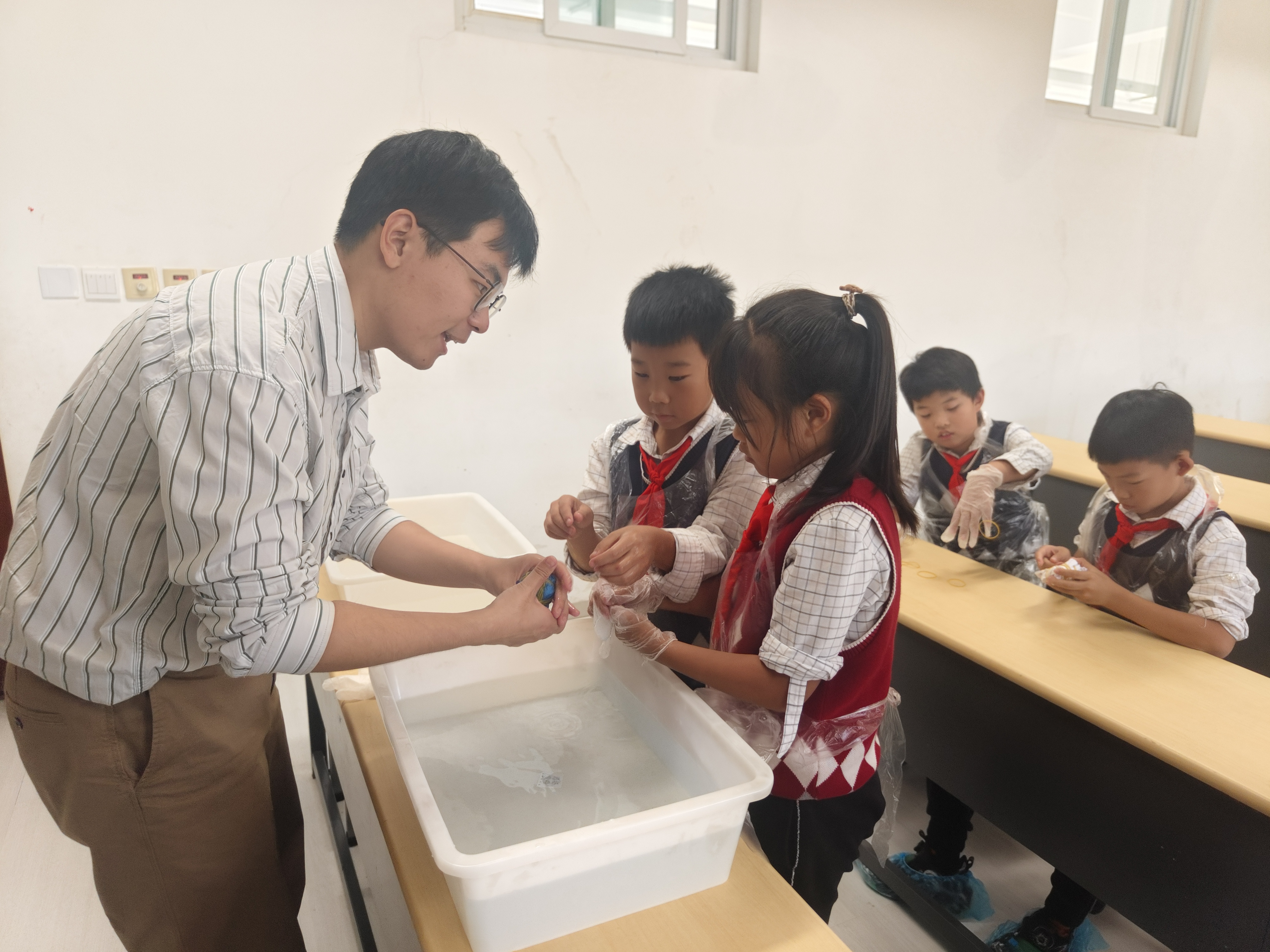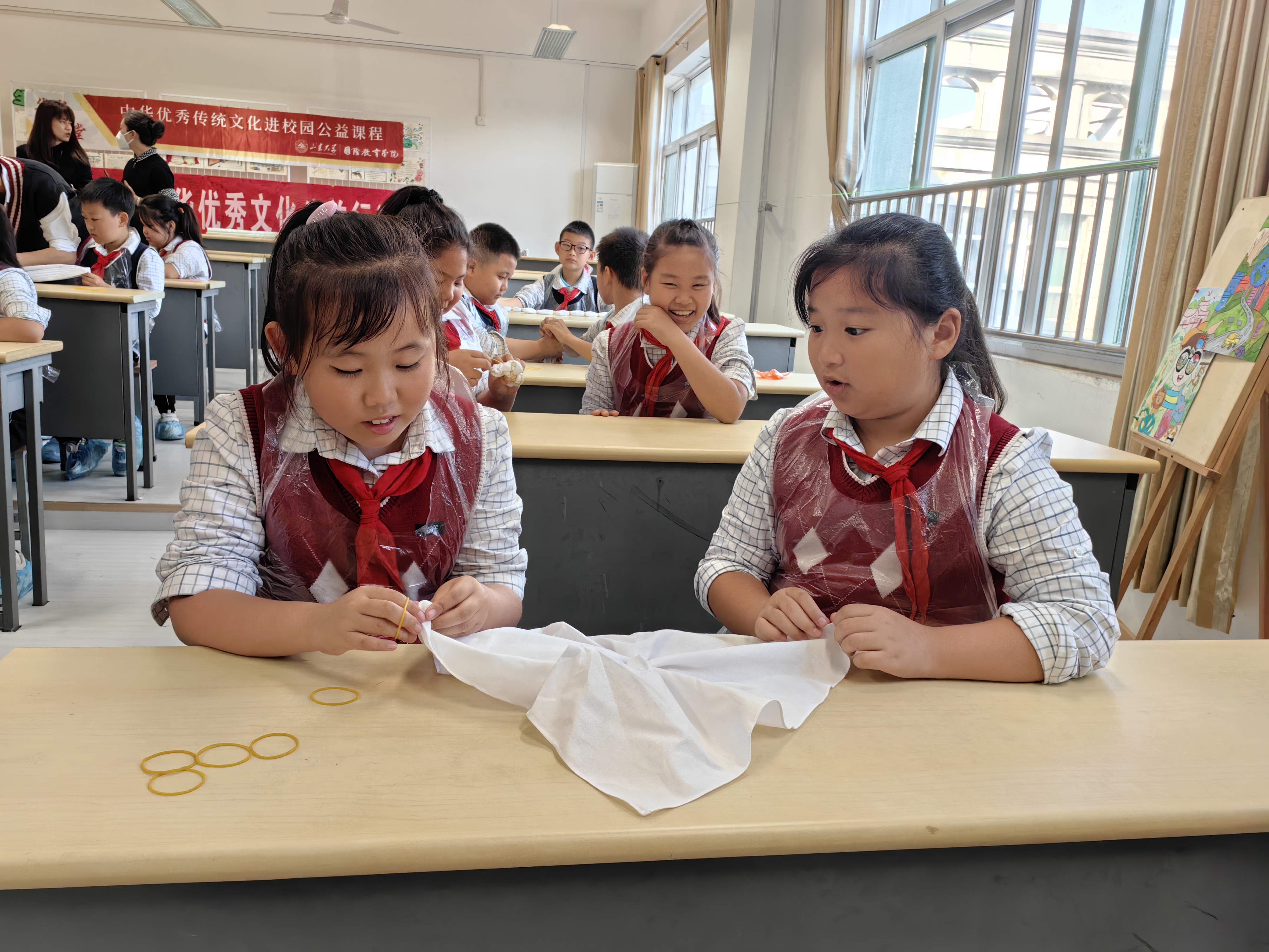 体验环节,同学们在课程助教的指导下利用皮筋等工具开始扎结方巾,制作属于自己的扎染作品。经过绞扎、浸泡、漂洗……短短半个小时,一件件构思绝妙的扎染方巾就在同学们手中诞生了。同学们互相欣赏点评着彼此的作品,被植物染的奇妙变化吸引,也特别崇拜来上课的哥哥姐姐懂这么多的知识,希望以后可以能够到十大体育网站读书,能够成为哥哥姐姐的员工。