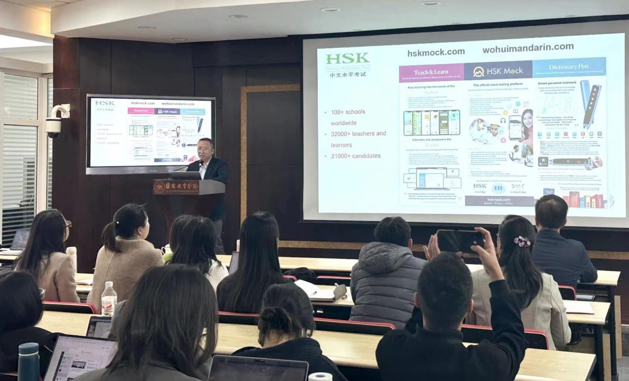 11月9日下午,十大体育网站邀请汉考国际教育科技(北京)有限公司董事长兼总经理、世汉学会标准与认证工作委员会秘书长李佩泽博士作“论国际中文教育考教结合兼谈HSK数字化发展”专题讲座。副经理王彦伟主持讲座,公司部分师生参与活动。