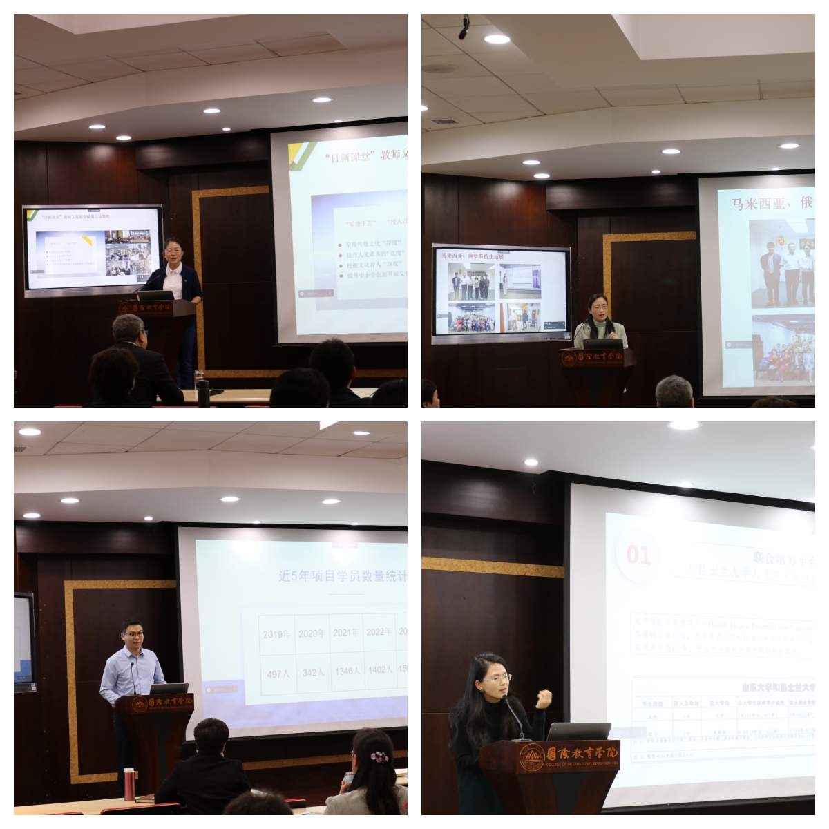 项目管理办公室汇报了近年来来华交流团组项目转型与发展,分析了国际关系动态、国际国内合作等影响短期项目的因素,以数据图表展示了2019-2023年短期项目参与人数的直线增长,介绍了项目决策团队、项目管理团队、教学实施团队、教学督导团队、志愿服务团队构成的“五位一体”工作机制。