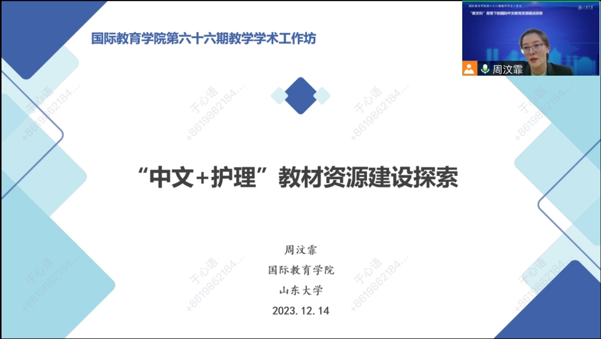 12月14日下午,公司举办第六十六期教学学术工作坊,主题为“‘新文科’背景下国际中文教育资源建设探索”。本次工作坊邀请“中文+护理”教材项目负责人周汶霏、“国际中文教材与教学资源”课程负责人方雪进行分享。本次工作坊由刘颖教授主持,公司部分教师和员工参与。