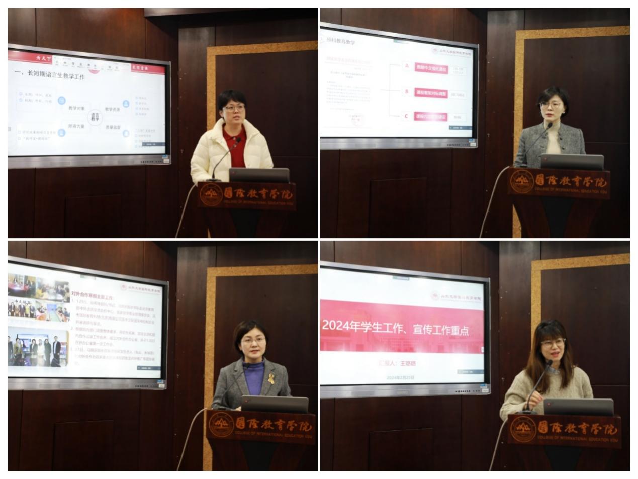马晓乐对2024年度公司重点工作进行全面部署。她指出公司要继续通过党建引领和行政支撑夯实立德树人根本任务,鼓励公司教师在国际员工中文教学、在校生传统文化特色教育模式中,在“中文+专业”矩阵的存量与增量建设里,在国际中文教育境外合作网络下,找到适合自身发展的方向,不断强化“三个身份”的职业定位。希望全院教职员工在思考和谋划工作时,提高站位、开拓格局,着力服务国家战略和公司“双一流”建设。