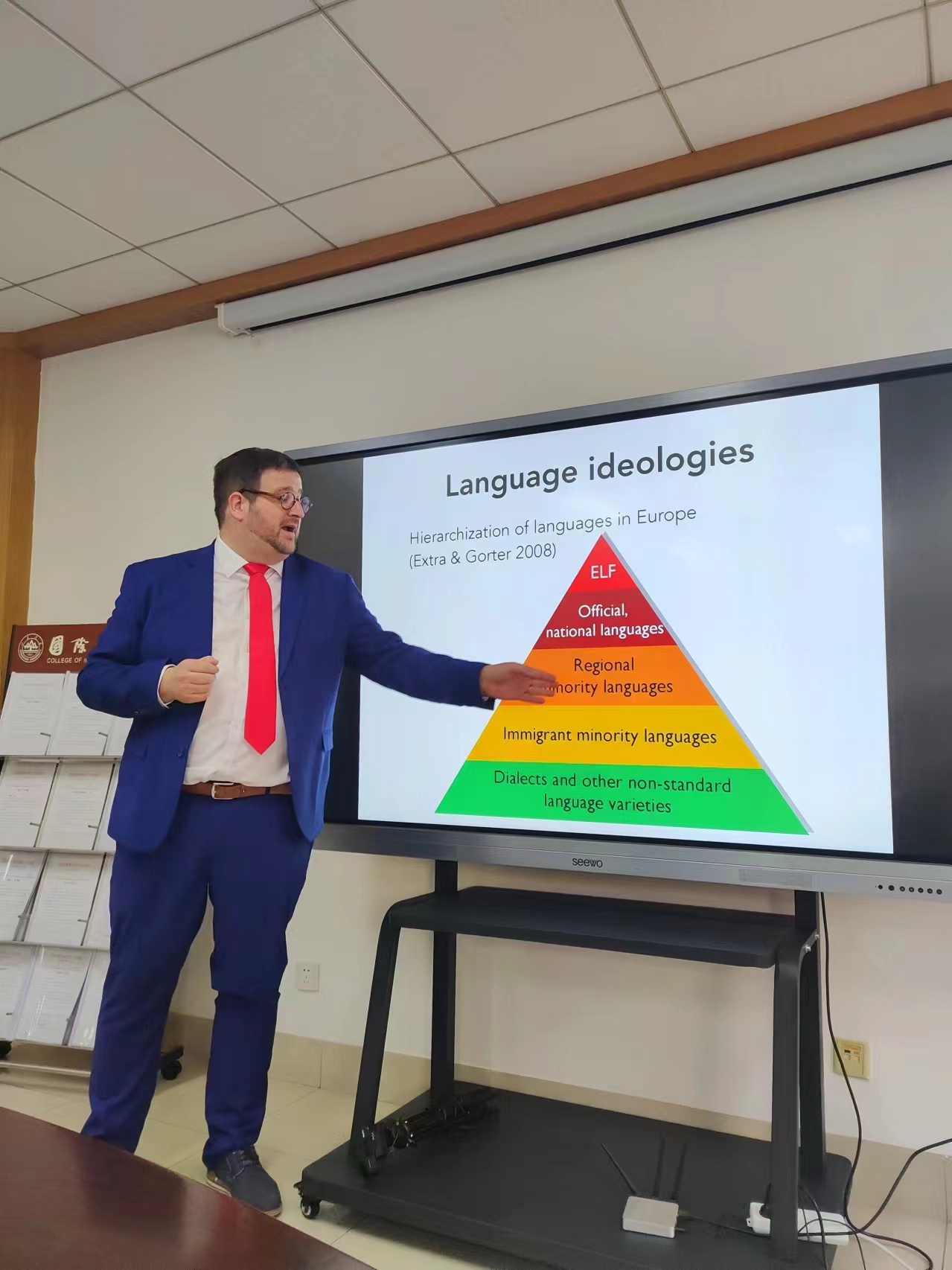 Rik Vosters 首先介绍了语言规划不同概念的侧重点和发展历程,从Spolsky语言政策理论框架出发,向师生们分别介绍了语言实践、语言信念、语言管理三要素。在语言管理层面,Rik Vosters介绍了本体规划、地位规划和习得规划等,向同学们分享了语域这一概念。在语言实践层面,Rik Vosters介绍了显性语言实践和隐性语言实践。在语言信念层面,Rik Vosters介绍了人们对特定语言、语言变体、语言特征、语言使用价值和地位等的感知、意见和看法。在讲座过程中,Rik Vosters 旁征博引,内容翔实,例证丰富。
