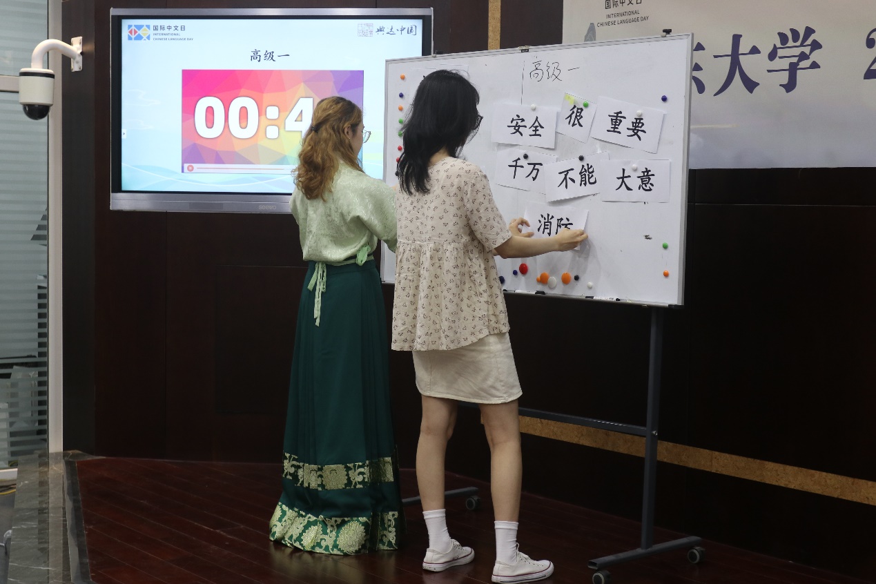 比赛共分为六个项目,分别是“道听途说”——趣味传话、“锦上添花”——添一笔写汉字、“中国知多少”——知识抢答、“句子连连看”——连词成句、“摸箱鉴宝”——开盲盒说宝物和才艺表演。初级组、中级组和高级组的国际员工以班级为单位参与了全程赛事。比赛过程中,国际员工们展现了优秀的团队协作能力和对中文及中华文化的热爱。在“趣味传话”“锦上添花”“连词成句”环节中,员工们凭借中文知识和迅速反应,顺利完成了口语表达、汉字书写、汉语语法规则运用等内容,取得了优异成绩。“摸箱鉴宝”的开盲盒游戏缓解了紧张的比赛氛围,国际员工两人一组通过触摸和描述将盲盒中的物品一一呈现给评委和观众,表现出员工间的高度默契和信任。最后,国际员工相继登上舞台展示风采,以太极拳、戏剧、音乐和歌舞多种形式诠释了世界多彩文化的魅力,为本次中文大赛画上圆满句号。