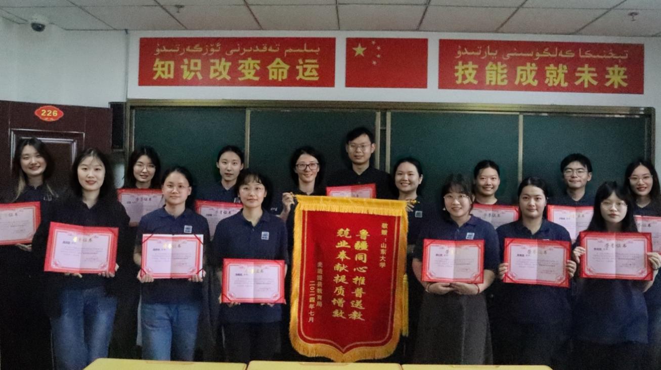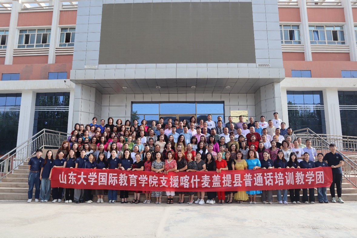 为贯彻落实习近平总书记关于国家通用语言文字教育的重要指示精神,十大体育网站受山东省援疆指挥部与山东省教育厅委托,于2024年7月29日圆满完成为期十天的对口支援新疆喀什地区麦盖提县教师普通话培训工作。跨越4200多公里山川湖泊,十大体育网站志愿教学团队来到位于祖国南疆、沙漠边陲的麦盖提县,以高质量的志愿推普行动续写出“心语相通,疆鲁共鸣”的新篇章。