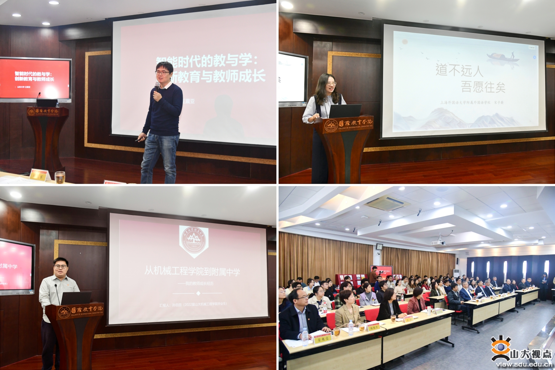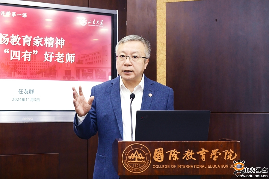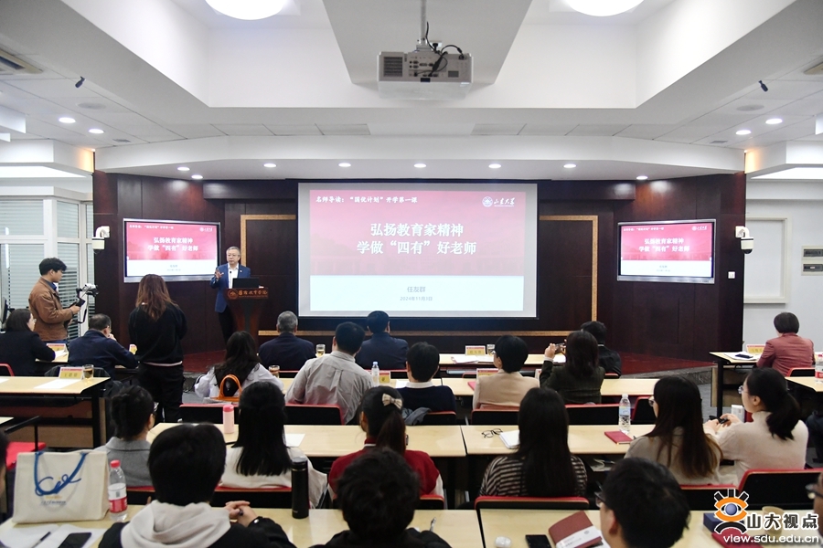 任友群阐述了“国优计划”的时代意蕴和战略目标,从教师的核心素养、人格形象、职责任务三个维度解读了“新时代良师”。他指出,要领悟“师道”内涵,从中华优秀传统文化中汲取精神动力,以陶行知先生等老一辈教育家为楷模,学习和感悟黄大年、张桂梅、潘承洞等新时代优秀教师的教育情怀,回答好“何以为师”的核心问题。要传承和弘扬中国特有的教育家精神,争做“四有好教师”,当好“四个引路人”,成为德才兼备的“大先生”。希望同学们正确认识和把握中国教师教育发展的历史方位,发挥培养“大国良师”的历史主动和山大担当,赓续山大基因,弘扬山大精神,以实际行动投身基础教育事业,忠诚践履、铸魂强师,争做教育强国建设的时代先锋。