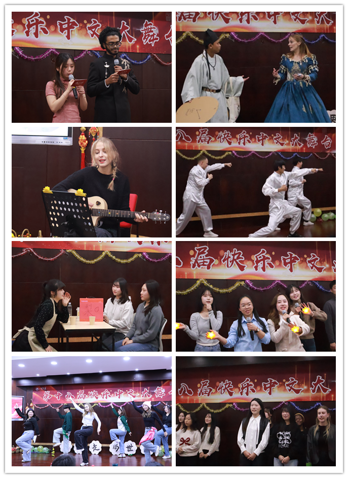 来自六个语言班的国际员工为大家带来了各式各样引人入胜的节目。有歌曲《童年》《朋友》《对不起,我的中文不好》《月亮代表我的心》,有电影配音《头脑特工队》,有舞蹈《叫我》,还有小品《穿越,好 city 啊》《都是发音惹的祸》,太极表演《功夫太极》。节目精彩纷呈、妙趣横生,现场欢声笑语不断,观众们沉浸在跨越国界的精彩表演中。无论是歌曲演唱、舞蹈表演,还是小品和太极展示,他们都努力将中文与中华元素融入其中,深刻体会到中文独特的韵律和情感表达,有效促进了中外文化的交流互鉴。