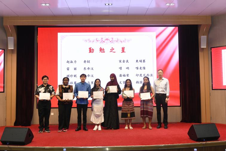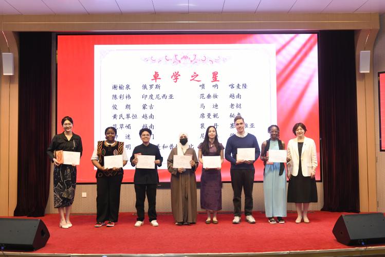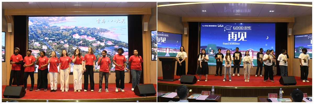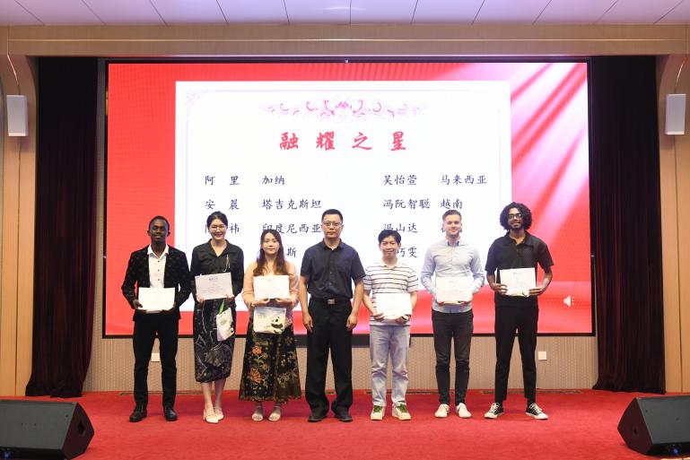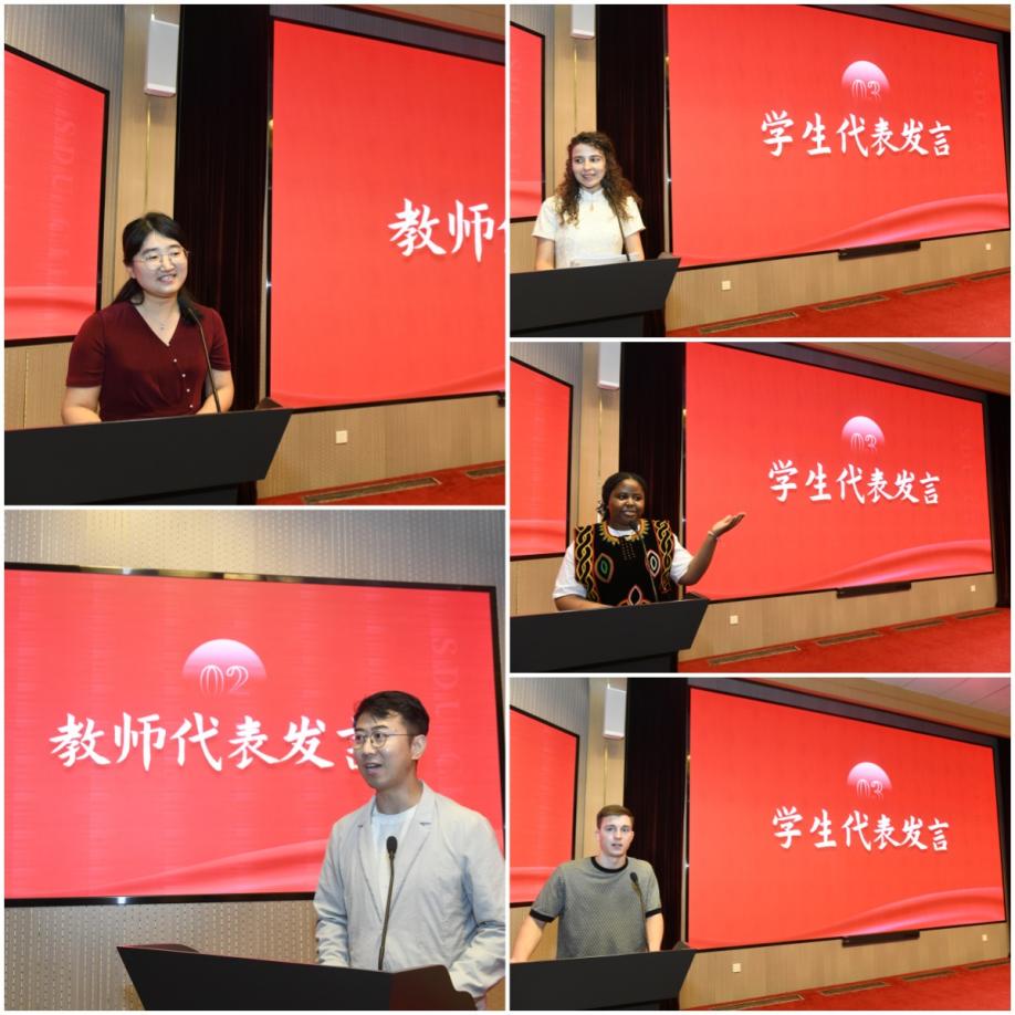 教师代表徐贺君和孙腾飞分别发言,回顾了与同学们相处过程中的难忘瞬间,细数同学们克服语言障碍、文化差异、学业压力带来的挑战,表扬了大家为实现梦想作出的不懈努力,表达了看到员工们进步和成长的欣慰与骄傲,以及离别之际对员工的不舍与祝福。语言生李思(古巴)、预科生唢呐(喀麦隆)、校际交换生苏行简(俄罗斯)作为员工代表分别发言,讲述了自己从初到异国的紧张、忐忑,到熟悉环境、爱上中国的过程。他们在这里和来自不同的国家、说着不同的语言、有着不同文化背景的同学们一起学习,感受中文和中国文化的博大精深,这段经历让他们收获了友谊、找到了热爱,也学会了理解和包容。