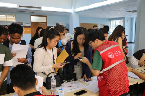 为保障国际新生顺利报到,公司积极与国际部、宿管中心等部门协同联动,提前做好各项准备。今年在校园WiFi使用、校园卡、线上注册、居留许可申请等各环节用图示实现流程可视化,方便国际员工操作,提高报到效率。多国国际员工志愿者为新生提供语言翻译、注册指导、答疑解惑服务,帮助国际新生融入校园生活。完成报到的国际新生也尝试了手作漆扇,体验中国传统文化。公司还设置打卡纪念版,营造温馨氛围。