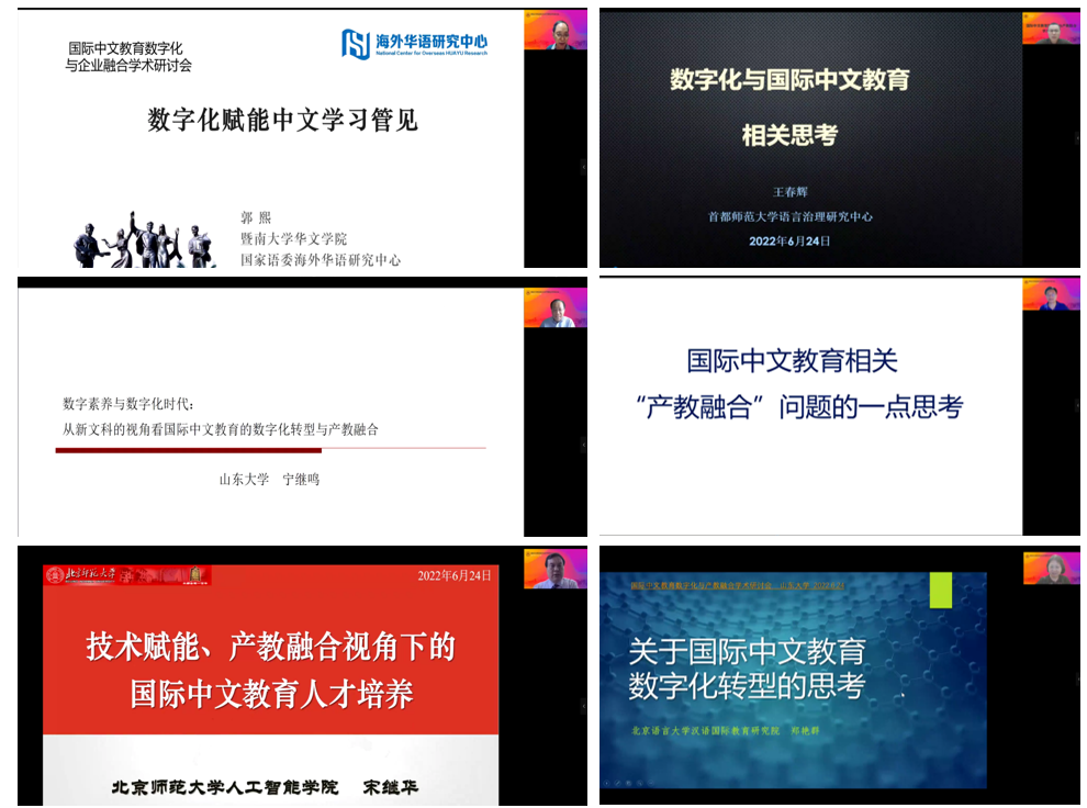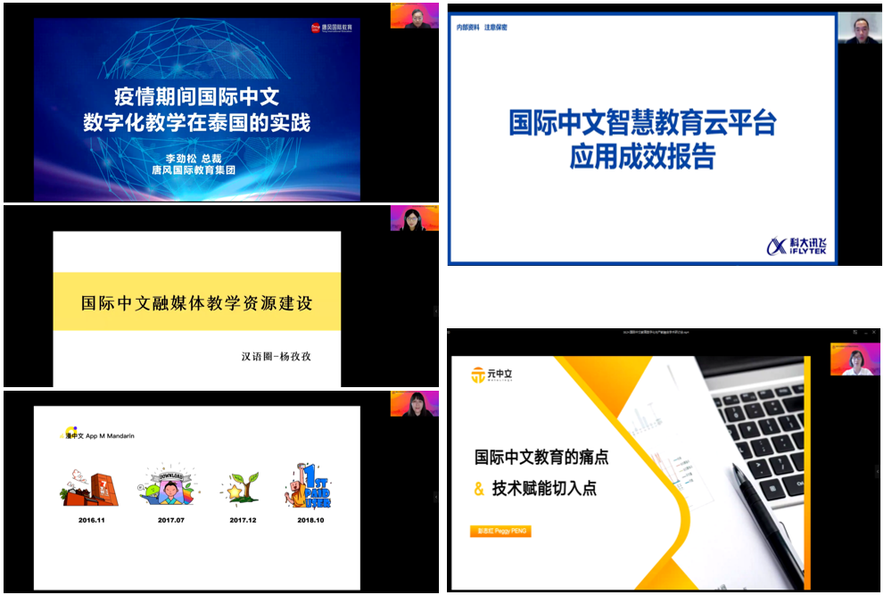 北京唐风汉语教育科技有限公司总裁李劲松以“疫情期间国际中文数字化教学在泰国的实践”为例,分享公司在中文教育数字化方面的探索,以及以“互联网+汉语教学”推动中文教育本土化的发展模式。孜孜华文教育科技(北京)有限公司总经理杨孜孜以其公司开发的汉语教学资源网站“汉语圈”为例,介绍了国际中文融媒体教学资源的特点与建设方法,分析了该类资源在跨平台应用、支持教育大数据收集、支持智能设备下的互动教学等优势,分享了企校合作建立高校人才孵化基地的探索与下一步想法。科大讯飞股份有限公司全球中文学习平台产品总监胡阳从产品介绍、应用场景、应用效果和国内外应用案例等方面详细介绍了其公司打造的聚焦中文学习和中华文化传承传播的智能语言学习平台——国际中文智慧教育云平台,体现了智慧教育技术与国际中文教育的有机融合以及技术创新赋能国际中文教学的改革。元中文数字科技(武汉)有限公司创始人、传神语联网研究院副经理彭志红通过分析国际中文教育在数字化时代中外深度融合物理空间建设、线上线下融合、从内容到团队的本地化等方面的痛点,提出以海外教育机构数字化打造线上线下融合基地、通过市场手段盘活国际中文教育零散智力资源、嫁接跨界资源联手打造语言学以致用闭环等技术赋能切入路径。北京多豆科技有限公司总经理窦敬壹结合“漫中文”平台研发和应用历程,从对外汉语教育创业者的角度提出硕士公司产品的思考,并以韩国中文学习市场为例,分析了国外中文教育的商业模式与市场潜力,建议将产教融合提前嵌入人才培养计划,加强行研合作,为发展可持续、可被广泛复制的商业模式打造行业的良性循环。