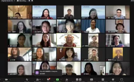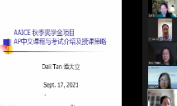 根据工作坊实施方案,随后的五场活动陆续展开。“美国外语教学理念与实践”专题主要围绕6种美国外语教学的新理念、ACTFL 5C教学标准以及3种常见的沟通模式进行了讲授和研讨;“AP项目设计”专题北弗吉尼亚两年制大学中文教授、国际语言系主任Dali Tan(谭大立)老师主讲,内容包括AP中文课程的发展历史、主题、课程标准以及AP中文考试的各类题型与特点、AP中文课程授课策略等;“从动机到评估真实语料教学”专题中,来自美国国际文教学会课程与教学主任Maggie Chen(陈美琪)老师结合多种线上教学网站和工具,生动展示了一堂线上中文课应该如何设计、导入、开展教学并进行评估;“可理解输入与运用”专题由Marty Chen(陈真秀)老师主讲她分享了在美国犹他州开展沉浸式中文教学的丰富经验,并结合个人经历分析了如何在课程实施中促进员工的可理解输入和运用;“语法教学:教学策略及课堂活动”专题由麻省理工公司中文讲师、美国国际文教学会会长陈彤老师主讲,以语法教学为例,从教学原则、教学理念、语法的呈现方式与操练等方面,分享了教学策略与课堂教学活动设计经验。
