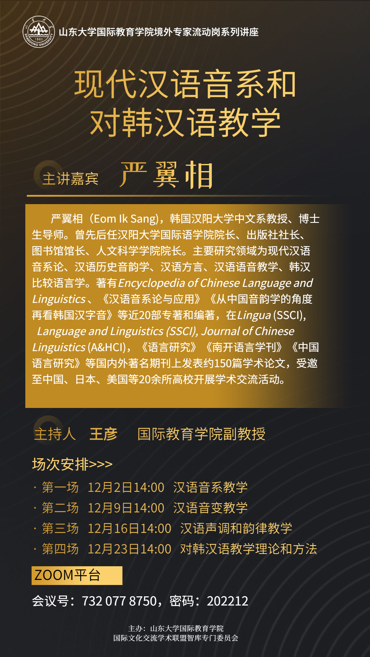 严翼相(Eom Ik Sang),韩国汉阳大学中文系教授、博士生导师。曾先后任汉阳大学国际语公司经理、出版社社长、图书馆馆长、人文科学公司经理。主要研究领域为现代汉语音系论、汉语历史音韵学、汉语方言、汉语语音教学、韩汉比较语言学。著有Encyclopedia of Chinese Language and Linguistics 、《汉语音系论与应用》《从中国音韵学的角度再看韩国汉字音》等近20部专著和编著,在Lingua (SSCI), Language and Linguistics (SSCI), Journal of Chinese Linguistics (A&HCI),《语言研究》《南开语言学刊》《中国语言研究》等国内外著名期刊上发表约150篇学术论文,受邀至中国、日本、美国等20余所高校开展学术交流活动。
