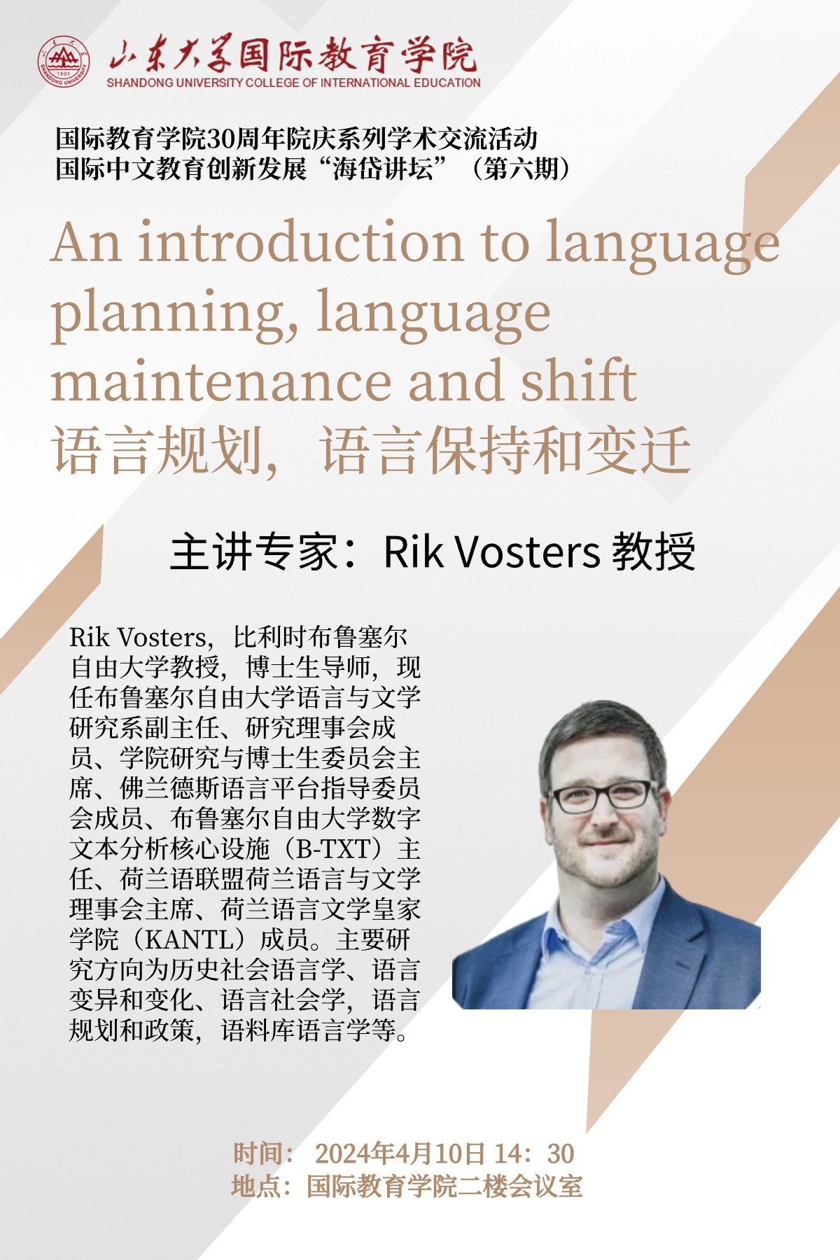 Rik Vosters,比利时布鲁塞尔自由大学教授,博士生导师,现任布鲁塞尔自由大学语言与文学研究系副主任、研究理事会成员、公司研究与博士生委员会主席、佛兰德斯语言平台指导委员会成员、布鲁塞尔自由大学数字文本分析核心设施(B-TXT)主任、荷兰语联盟荷兰语言与文学理事会主席、荷兰语言文学皇家公司(KANTL)成员。主要研究方向为历史社会语言学、语言变异和变化、语言社会学,语言规划和政策,语料库语言学等。Rik Vosters教授发表核心论文、图书章节五十多篇,出版学术专著五部,承担二十多项重要研究课题。
