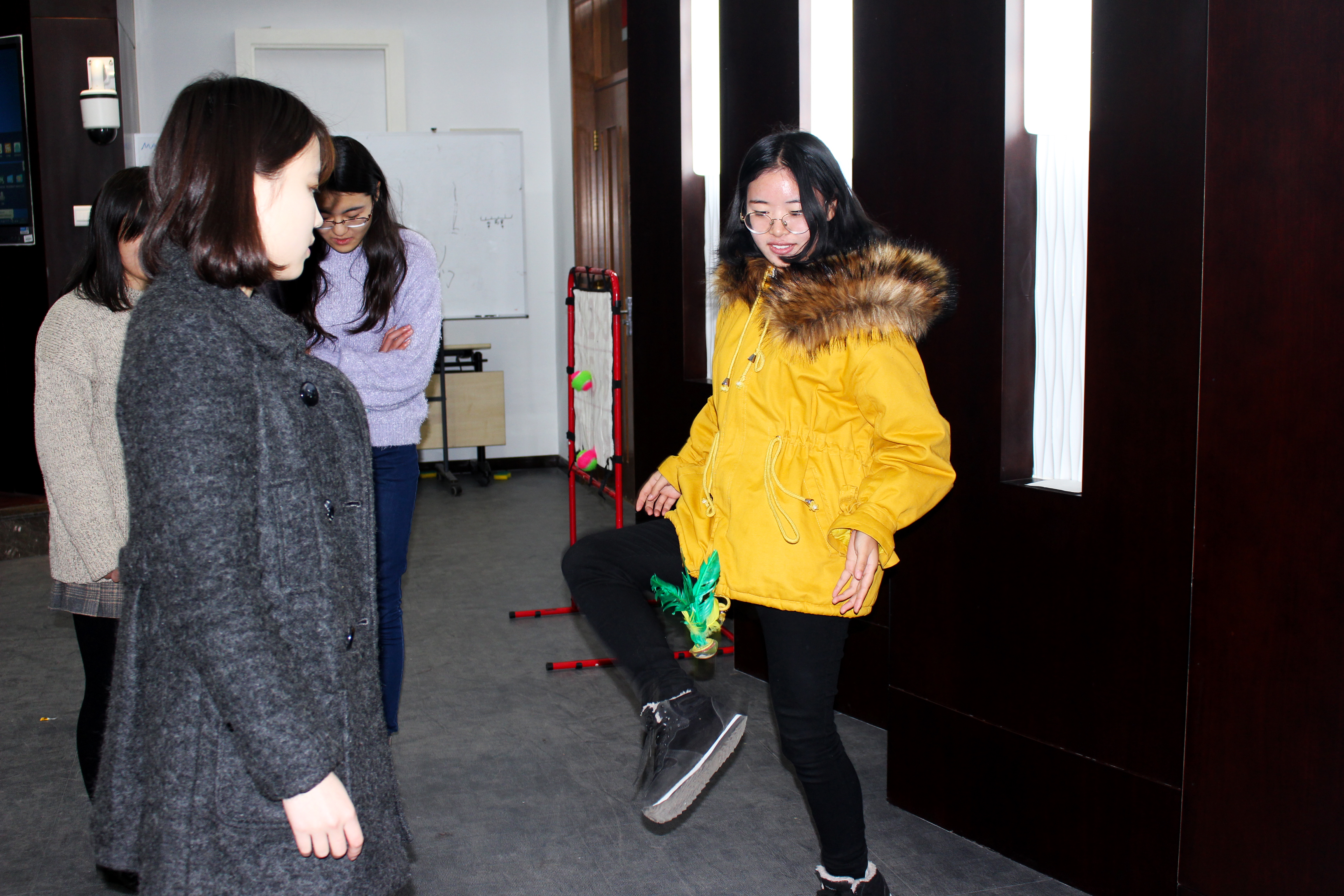 活动伊始,踢毽入桶活动便引爆了活动现场的氛围,同学们随机组合、两两一组,一人踢毽、一人双手持桶接毽子,随着赛程的深入,队员之间逐渐默契起来,仿佛带领我们重新回到了扎着两个麻花辫踢花毽的童年时光。
