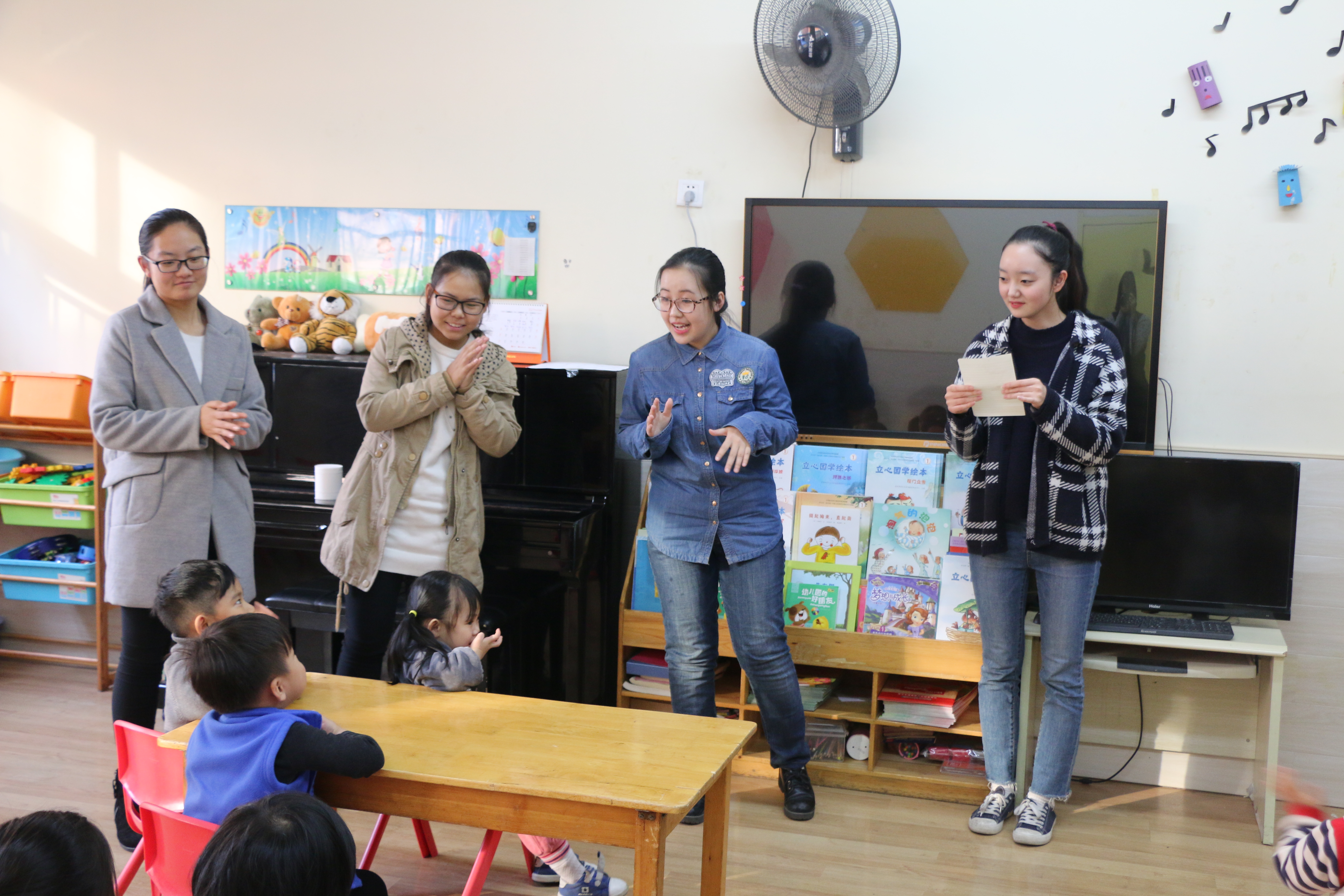 11月17日下午两点,志愿者们便搭乘公交车来到了大风车幼儿园,按照之前的分组分别进入大班、中班、小班进行教学。在向小朋友做过自我介绍后,便开始了教学活动。首先,韩国志愿者向小朋友们教授了如:“爸爸”、“妈妈”、“老师”等简单的韩语词汇,使孩子们对学习新语言产生了浓厚的兴趣。接下来,中韩志愿者们分别教孩子们唱了《小白小白上楼梯》《三只熊》等儿歌,孩子们十分活泼,与志愿者们一同演唱。教学楼里充满了孩子们的欢声笑语。