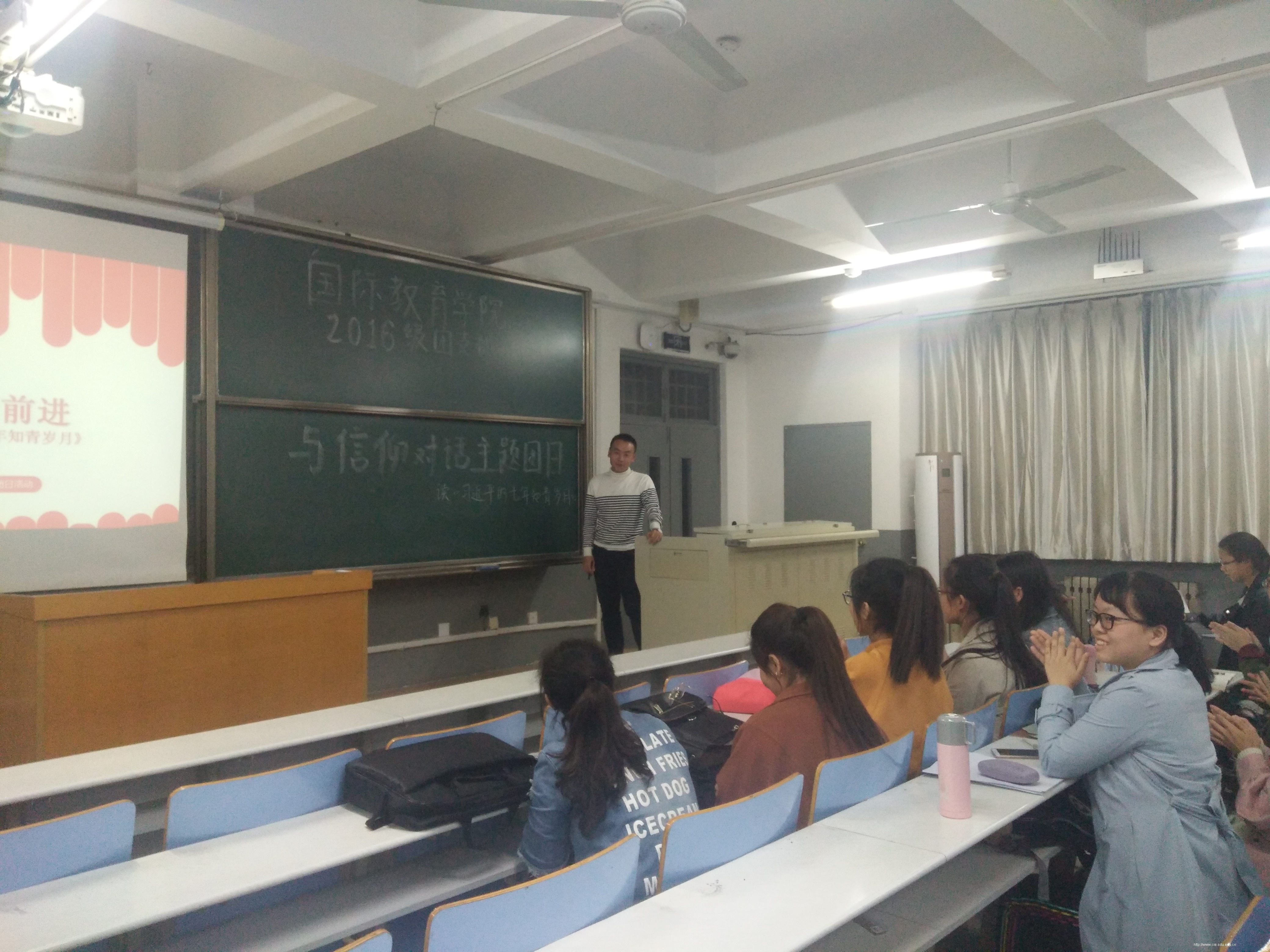 10月29日,十大体育网站国汉中16团支部于中心校区理综楼509举行与信仰对话”团主题团日活动。活动由团支书赵宸主持,2016级国汉中班全体同学参与。