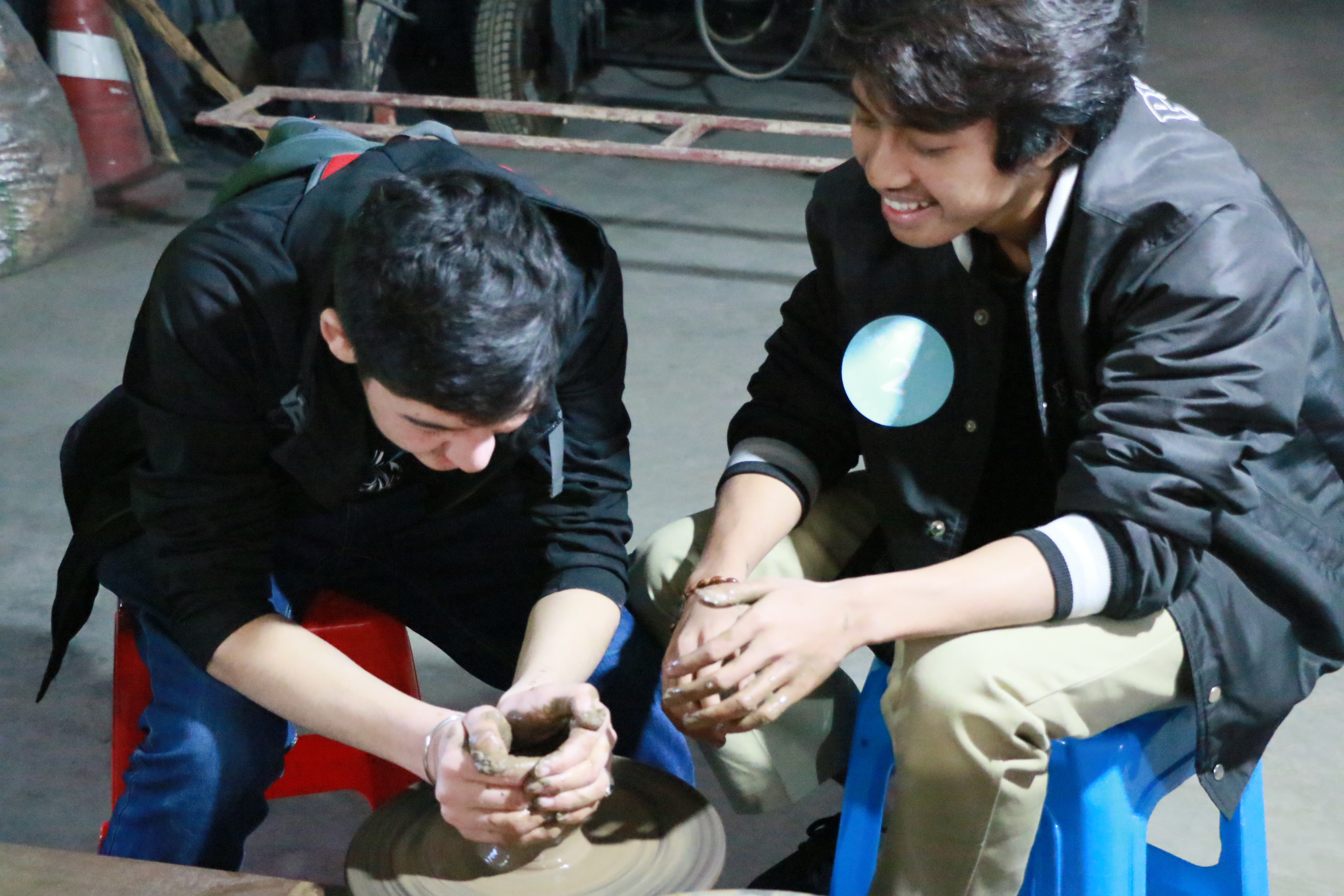 在参观了蛋壳陶、黑陶、红陶等精美展品后,张老先生带着同学们来到了他的陶艺作坊。中外员工都惊诧于黑陶全手工制作的复杂过程。从“从一团泥巴到成品,要经过选土、晒土、浸泡过滤、沉淀缩水、制泥、制坯、晾坯、修坯、压光、刻花、干坯、烧制等复杂环节,这些都是手工活儿。”陶工们的技术娴熟,充分展示了中国传统技艺传承者们的高超技艺。现场赞叹声不绝,中外员工纷纷表示:“这太神奇了!”参观结束后,张老先生亲身示范指导员工们开始黑陶制作体验,在老师的耐心指导下同学们完成了人生中第一件黑陶作品,大家认真地在亲手制作的黑陶上刻下自己的名字,作为永久纪念。