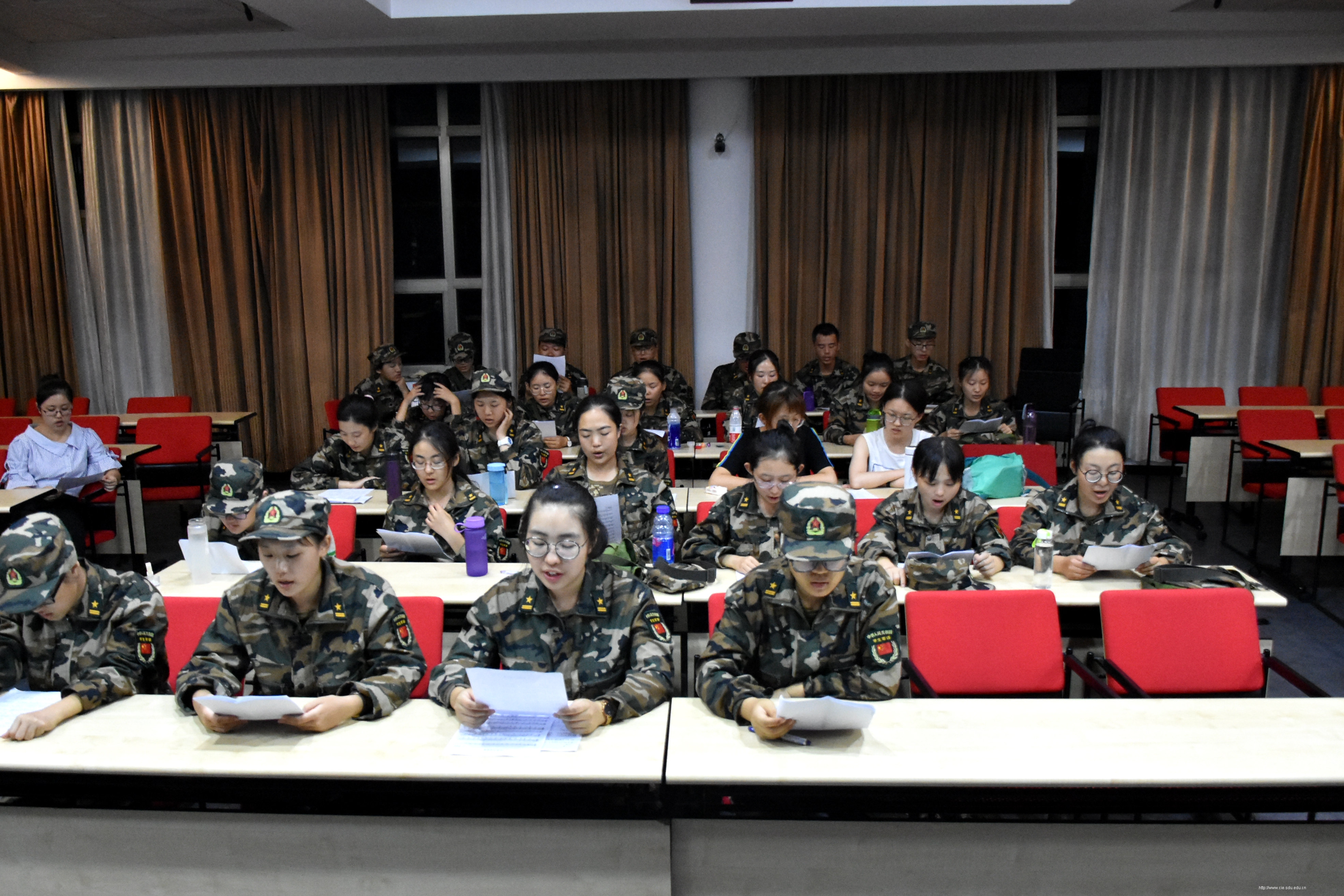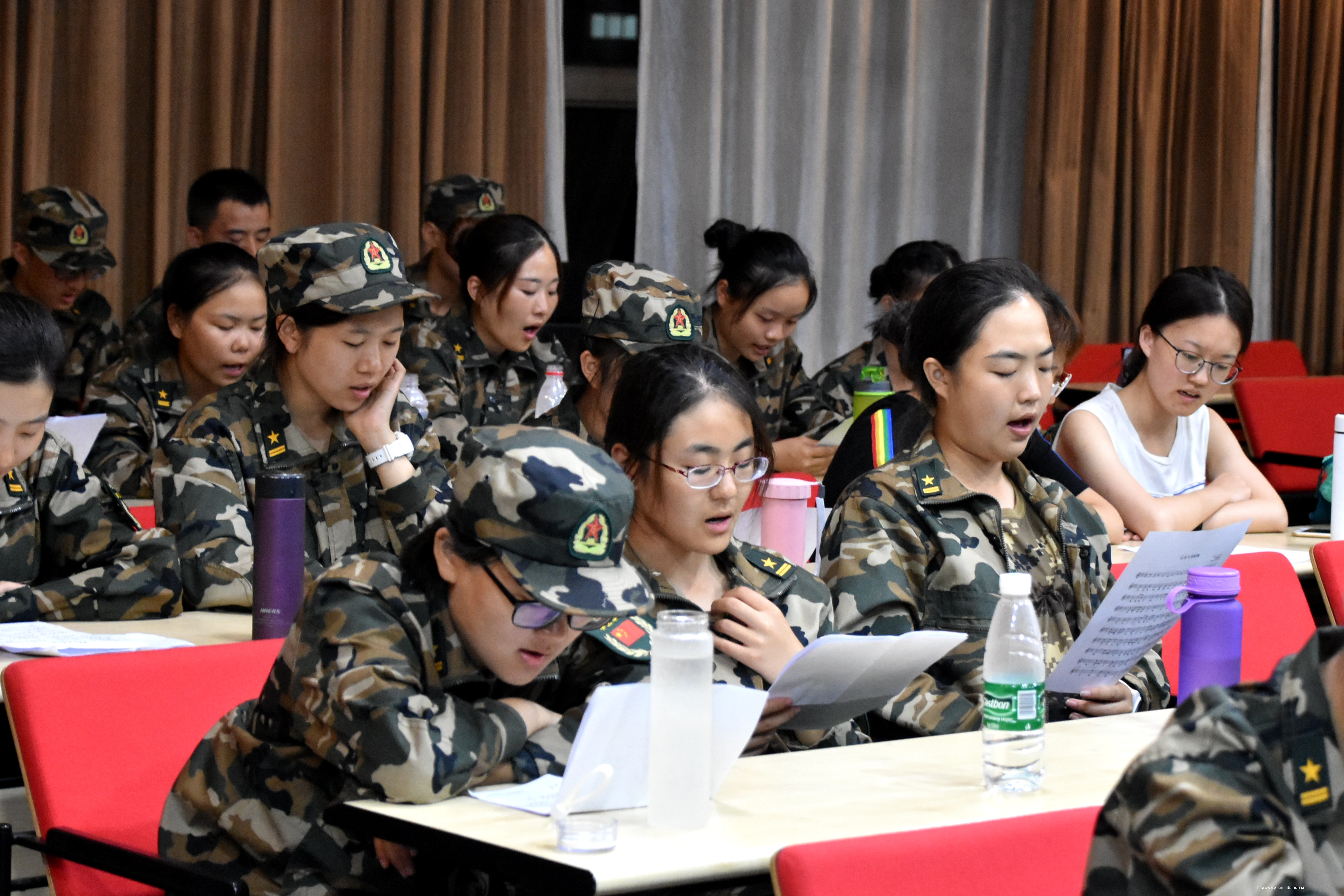 晚训结束后,2017级新生迈着整齐的步伐来到公司报告厅。经过了一整天的高强度训练,同学们身体都十分疲惫,但是他们仍旧以饱满的热情投入到学唱校歌的活动当中。