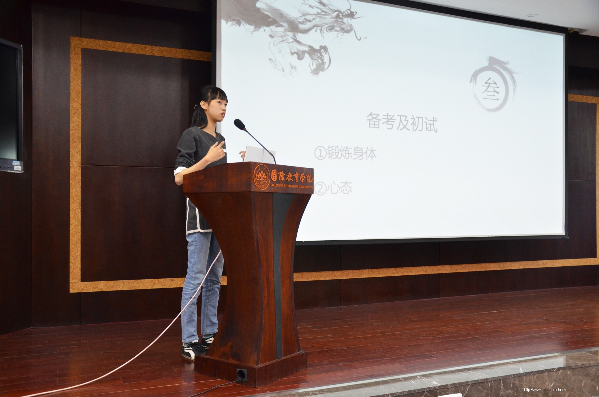 张灵心首先介绍了全国重点院校汉语国际教育专业硕士研究生的开设情况,随后,她详细讲解了考研的具体流程并针对本专业分享了考研的参考书目。陈敏则从“考研基本流程”、“复习时间安排”、“政治英语复习”等三个方面分享了考研中的注意事项及学习方法。与前两位主讲人不同,沈鸿雁的讲解更侧重于考研期间的学习方法和时间安排方面,具有很大的借鉴意义。梁文琴则从个人实际出发,就跨校跨专业考研的一些技巧作以详细说明。