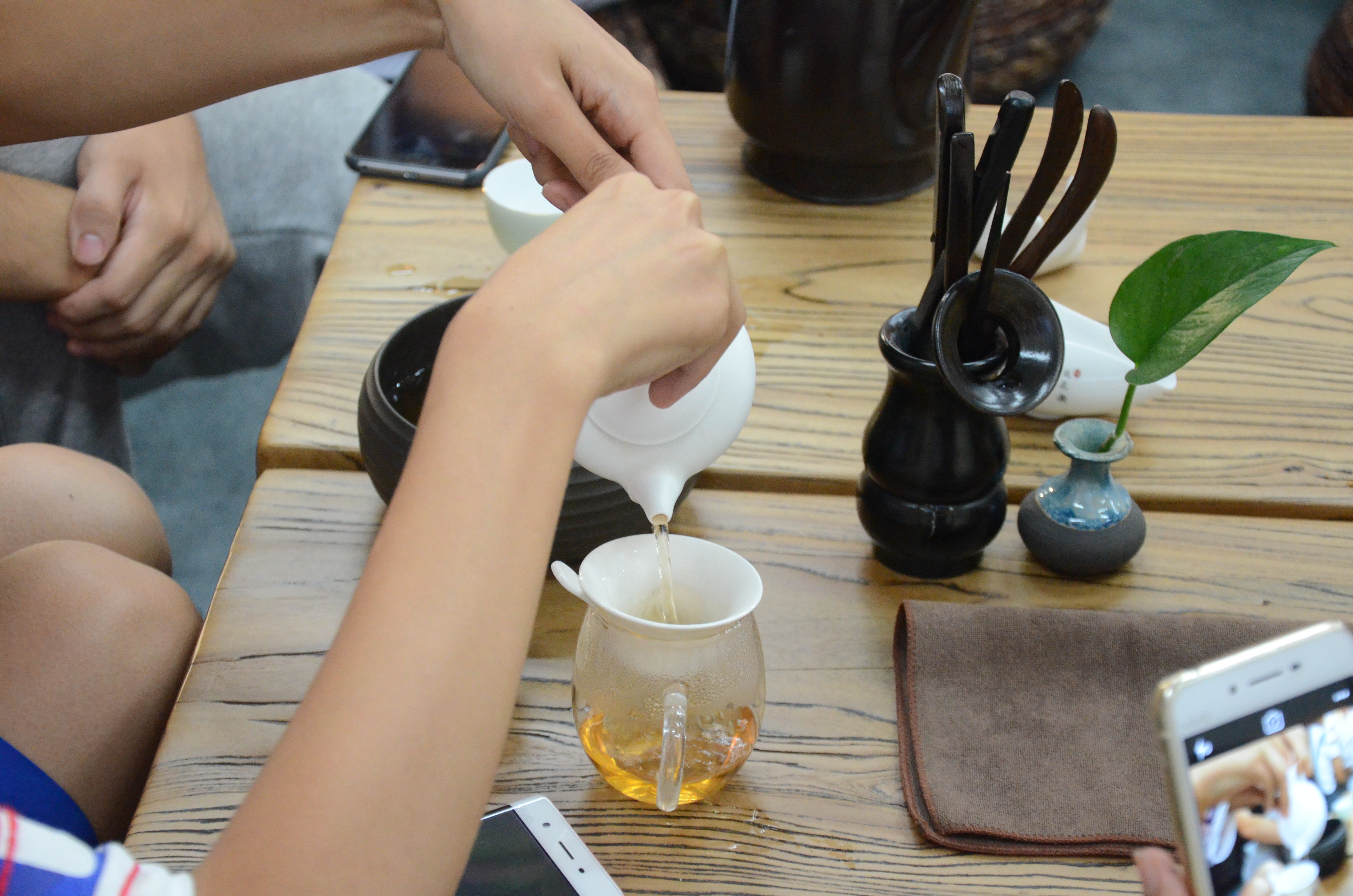 在同学们与自己的拓印作品合影后,老师请同学们安坐在蒲团上,为大家展示茶道的艺术,“茶,香叶,嫩芽,慕诗客,爱僧家,碾雕白玉,罗织红纱。”。同学们跟随老师学习了“茶道六君子”和沏茶方法,随后分组泡制了青茶、绿茶、黑茶、红茶和花茶。泡制好后,各组之间互相交换品尝,同学们的情谊也在氤氲的茶香中得到深化。
