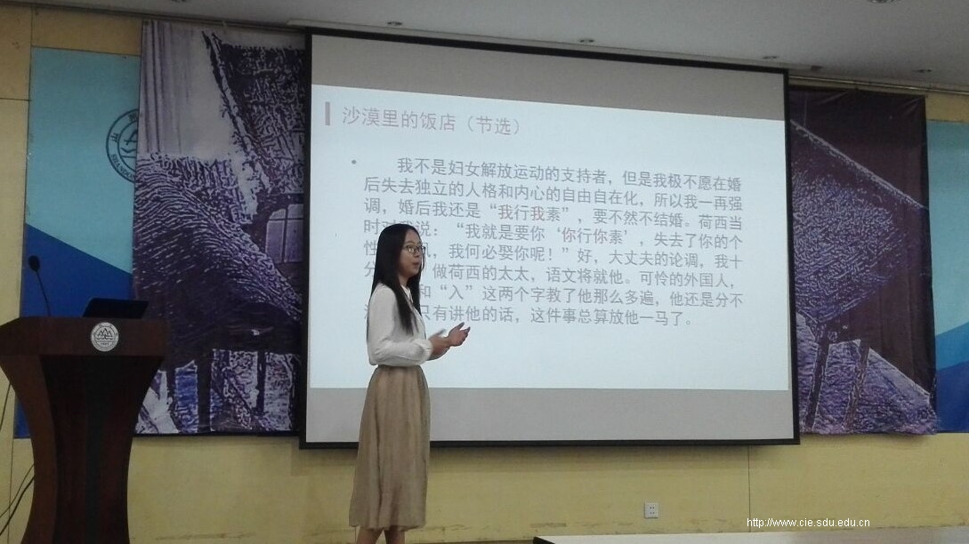 “三人行,必有我师”教学趣味模拟竞赛活动借鉴陕西卫视《超级老师》节目,旨在为同学们提供一个练习教学技能的平台。在第一轮比赛中,9位选手选择新颖有趣的话题,进行了精彩讲解。他们有的模拟了汉语教学的场景:刘真同学以海外幼儿为教学对象进行汉语教学,充满童趣的儿歌《什么好》带来欢笑;杜中玉则讲授了现代汉语中的一个修辞手法“仿拟”,以三毛与荷西的爱情故事作引,新颖独特,引人入胜。有的从现实生活中发掘教学话题:郑明月的“你有拖延症吗”将人性贪玩的一面比作“小猴子”,将最后期限比作“大魔王”,生动形象;李俊萱的“中西文化碰撞”讲述了中外交流中发生的趣事,告诉大家面对不同的文化要秉持“兼容并包”的态度;周冰玉“心理小课堂”以和颐酒店事件为切入点讲解了“公正世界信念”的概念与影响。有的以历史故事为题材:管璇借助大型古装电视连续剧《芈月传》为大家讲述了秦国的历史;李静茹则以“多情皇帝”为切入点讲述了光武帝刘秀与阴丽华的爱情故事。各位评委针对各位同学在第一轮中的表现给出了许多建议,如时间掌握、话题引入,课堂互动等。李俊萱、周冰玉、杜中玉、郑明月、刘真、王思维等6名同学晋级到第二轮。