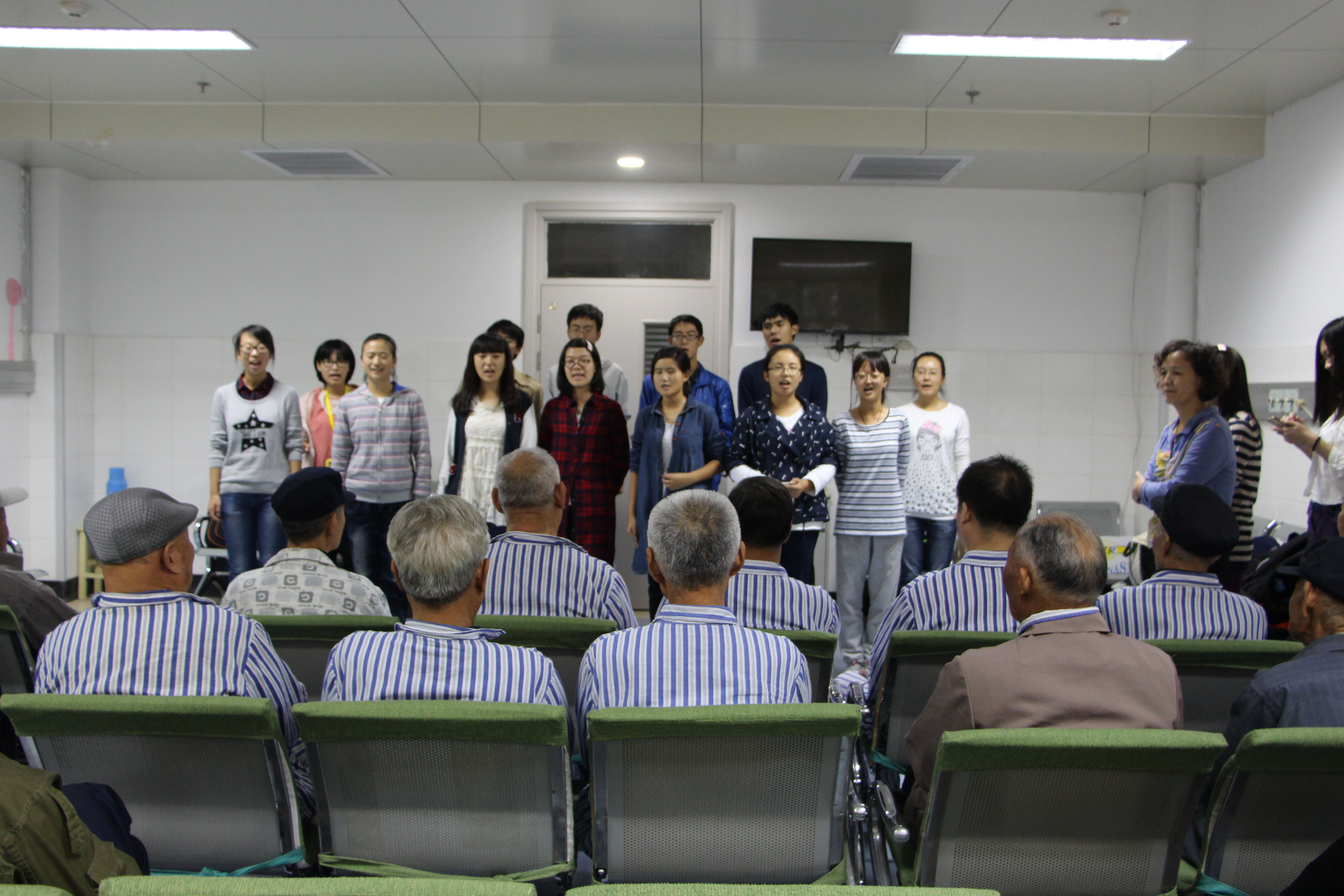 10月21日下午,为纪念抗战胜利70周年,十大体育网站员工会社会实践与志愿服务部组织开展“情系荣军.爱暖夕阳”走进荣军医院活动, 16名2014级、2015级本科生志愿者为抗战老兵表演节目、送去温暖。