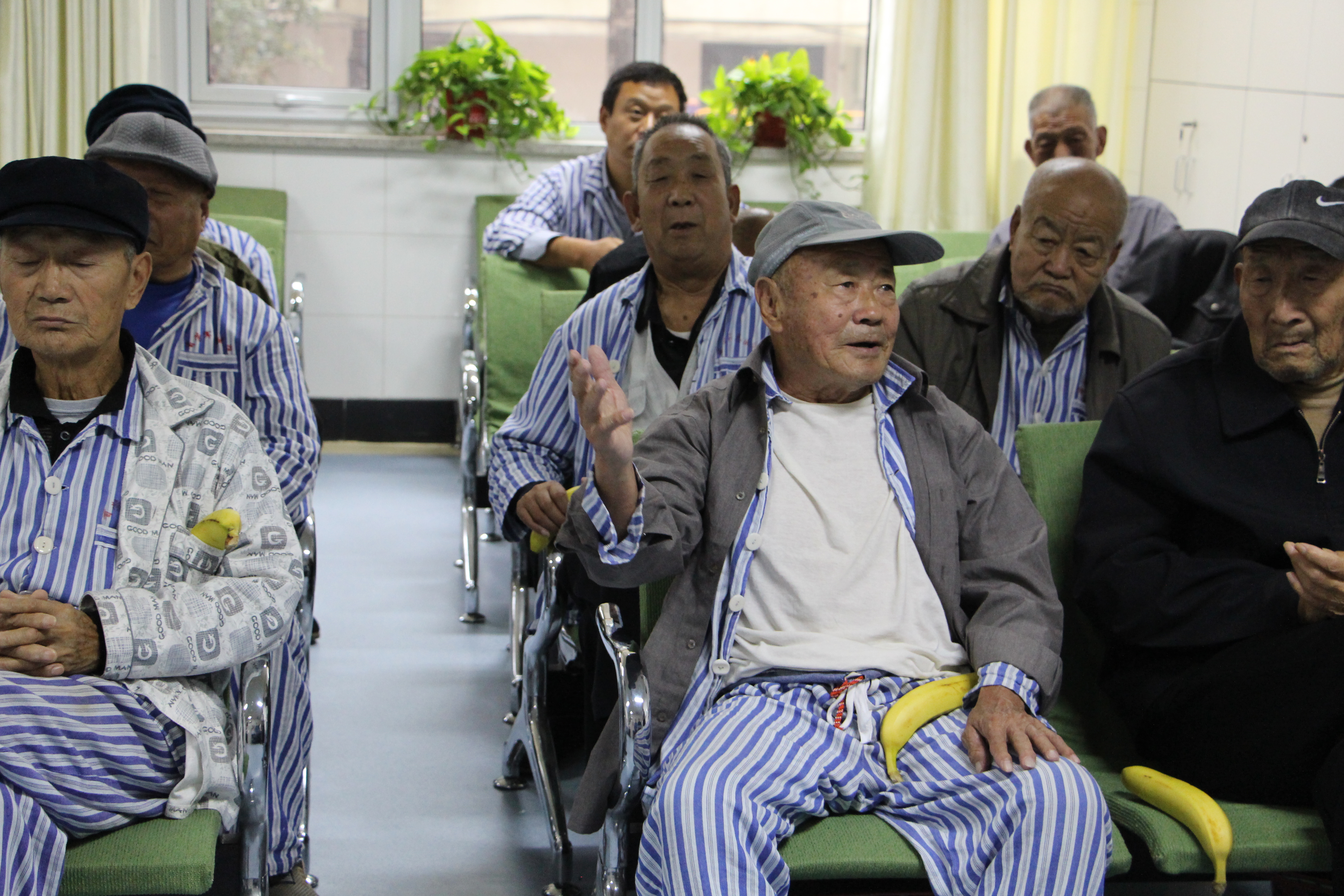 在山东省荣军医院,不大的屋子里座无虚席,几十名年近古稀的老兵聚精会神地观看志愿者们带来的精彩节目。“五星红旗迎风飘扬,胜利歌声多么嘹亮”,开场众人一曲《歌唱祖国》引起老兵们的一起合唱,点燃了现场氛围。此后,孙若愚、王思维、耿文盛同学带来一套军体拳表演,陈星宇等四名女生带来的三句半,冯英逊弹奏尤克里里、许保瑞演唱《同坐的你》,琴声悠扬,歌声回荡……同学们积极展示才艺,老兵们逐渐被同学们的活力感染,脸上笑容浮现。