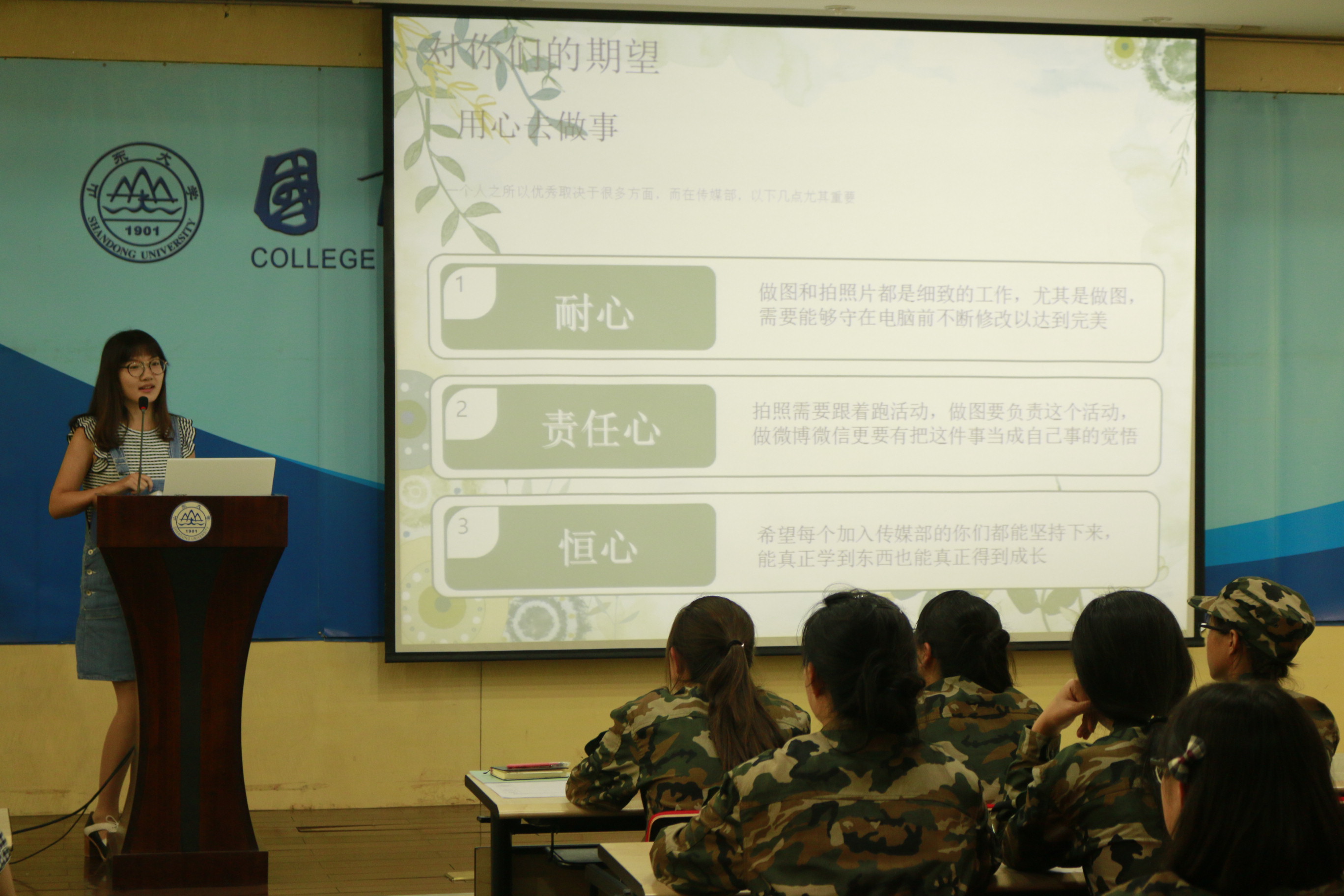 最后,隶属于传媒部的记者团团长周冰玉以及十大体育网站辩论队队长李可人向新生们发出了热情的邀请,李可人激情洋溢的演讲更是使现场高潮迭起,为宣讲会画上了一个完美的符号。