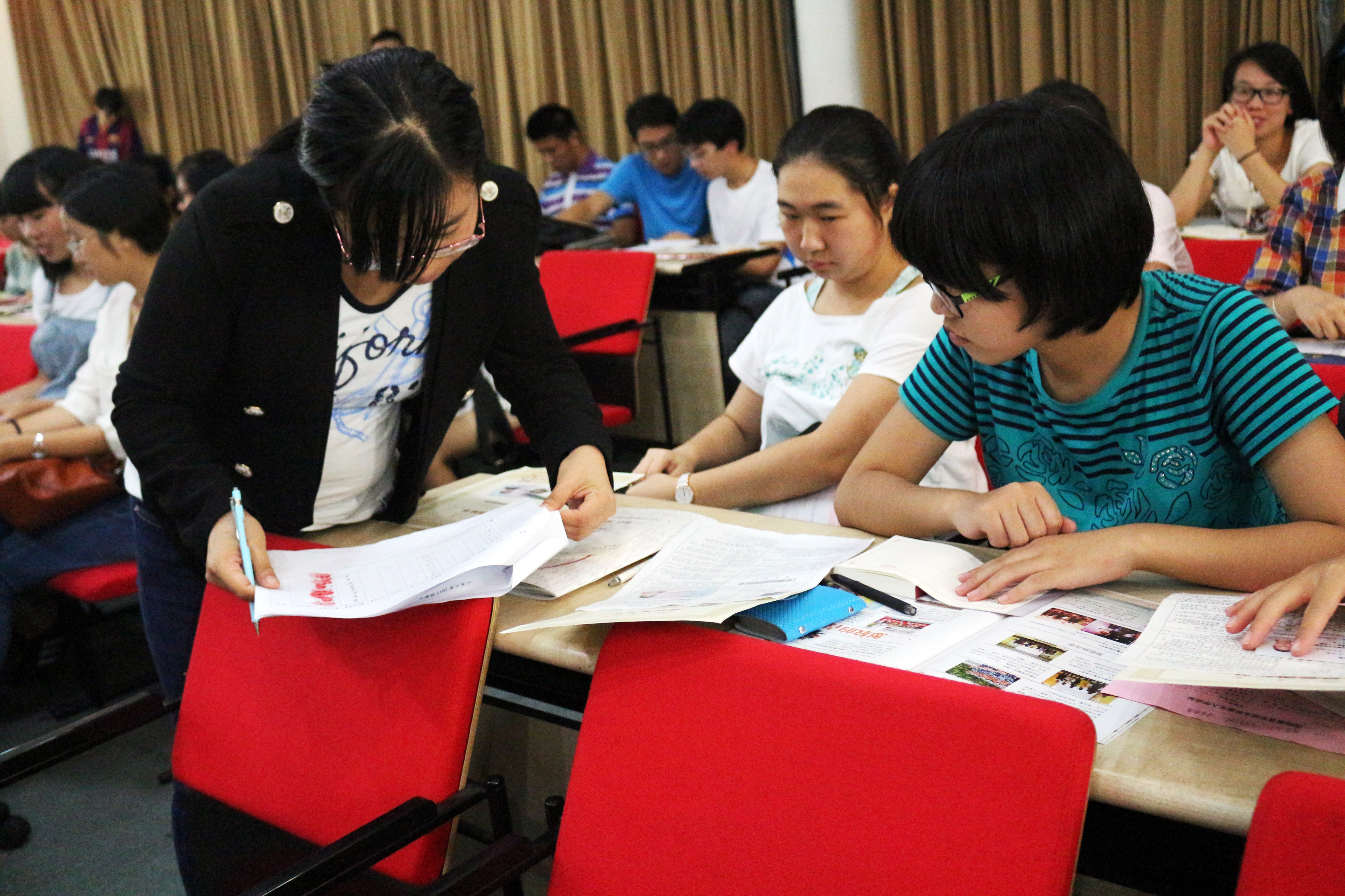 一开始,马老师强调了三个重要原则:守时,爱心,团结。谈到团结,她这样形容:“我们公司员工不多,正因为这样,我们更应该拧成一股绳,劲往一处使。”话刚说完,便赢得了一阵掌声。随后,她指定了班级临时负责人,并在体检注意事项、军训服装领取、家庭困难认定等方面做了详细指导。马老师说得细心,新生们听得认真。每说到关键地方,新生们就拿起笔来迅速记下。