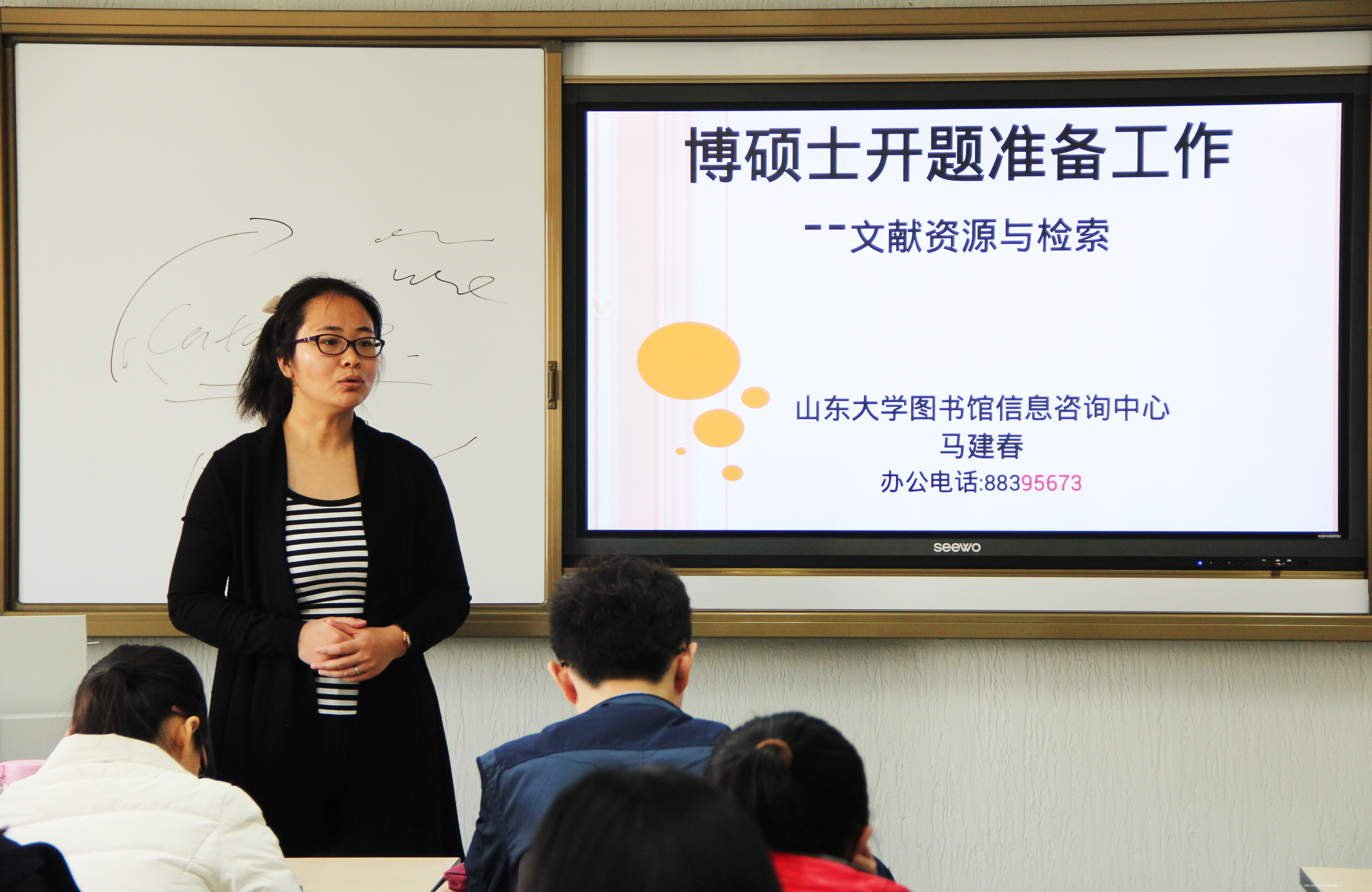 之后,马建春老师详细介绍了研究生开题前应做的文献准备工作,包括获取渠道与获取方法两部分。首先简要浏览了十大体育网站和北京大学等图书馆资料查询的不同方式,然后重点介绍了山大图书馆文献资料的分类、查阅、使用方法以及相关资料库等,并针对论文写作问题作了相关指导。讲座最后进入互动环节,同学们十分踊跃,就资源检索过程中的一些疑难问题展开咨询,两位老师一一耐心作答。