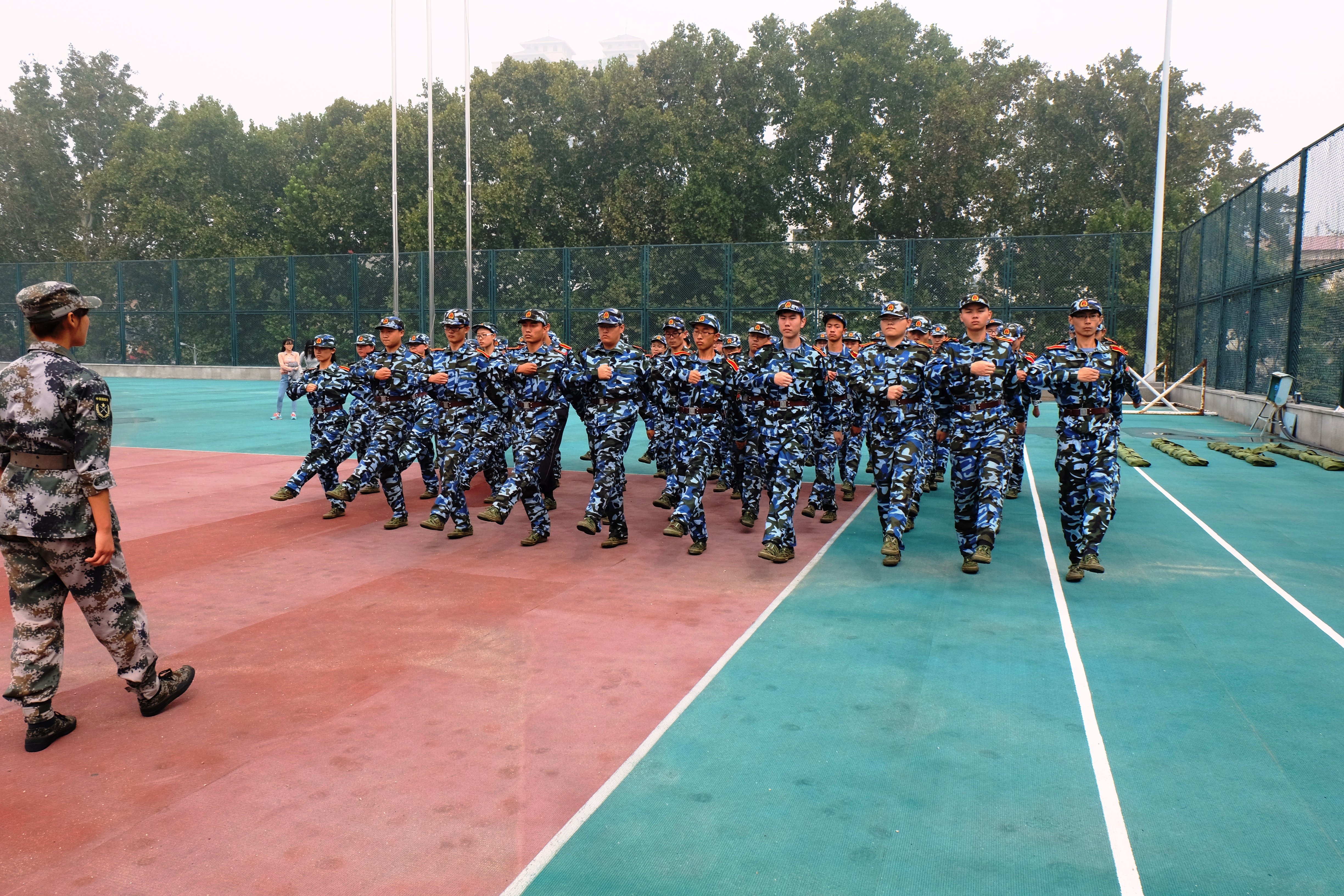 连续的雨天终于过去,迎来了晴天。早上雾还未散去,中心校区的操场上,已经充斥着绿色军营的味道,活跃着大一同学们青春的身影。这是军训正在进行中。