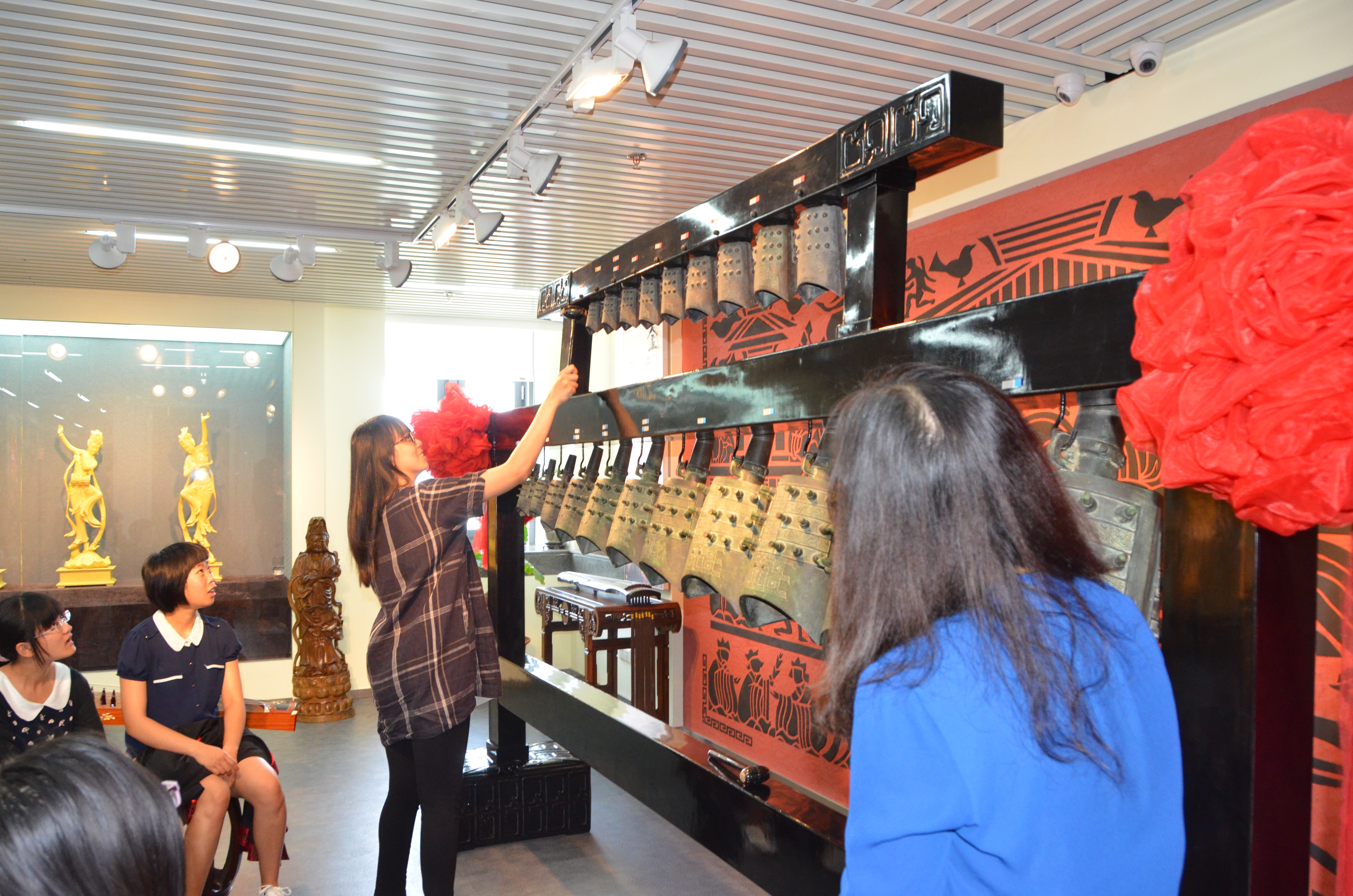 悠扬的编钟声传来,同学们都被吸引到了古乐专区。精美的编钟让同学们不住地赞叹,纷纷谈起了自己知道的编钟历史。看到老师在编钟上敲出了《欢乐颂》的旋律,同学们也跃跃欲试,纷纷抢着想要 “过把瘾”。听着自己敲奏出的美妙的音乐,同学们也真正近距离接触到这个以前只能从历史课本里见到的乐器。志愿者与讲解老师用古筝和编钟合奏一曲《茉莉花》,将同学们的注意力又吸引到优雅的古筝演奏上来。经过志愿者的指导,即使以前对音乐接触不多的同学也能抚琴弹奏一曲《笑傲江湖》,当了一回“古筝公主”。